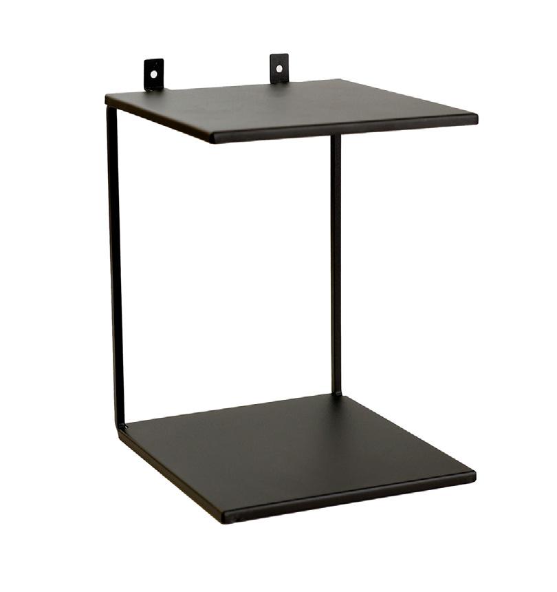 Un elegante estante de doble nivel en color negro, diseñado para paneles acústicos. Fabricado en metal duradero con recubrimiento en polvo, ofrece una solución de almacenamiento estilosa y funcional sin comprometer las propiedades acústicas de los paneles. Incluye tornillos para una instalación sencilla.