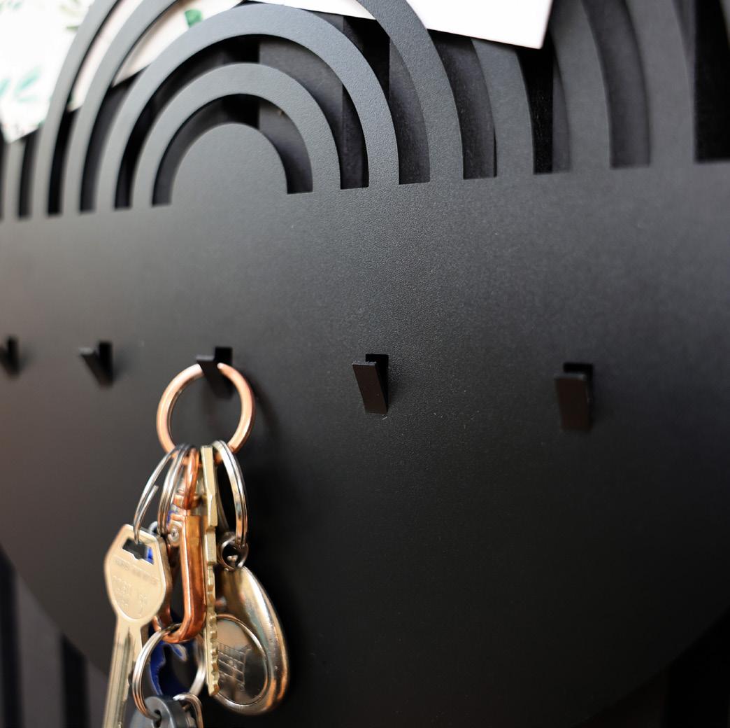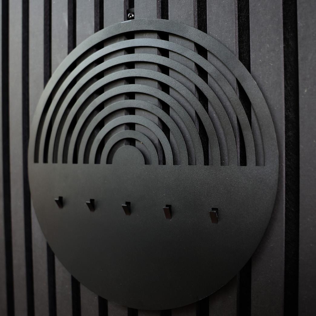 Elegante rejilla negra con cuatro ganchos, diseñada para su montaje en paneles acústicos. Ideal para organizar elementos esenciales en oficinas, cocinas y entradas. Incluye tornillos para una instalación sencilla