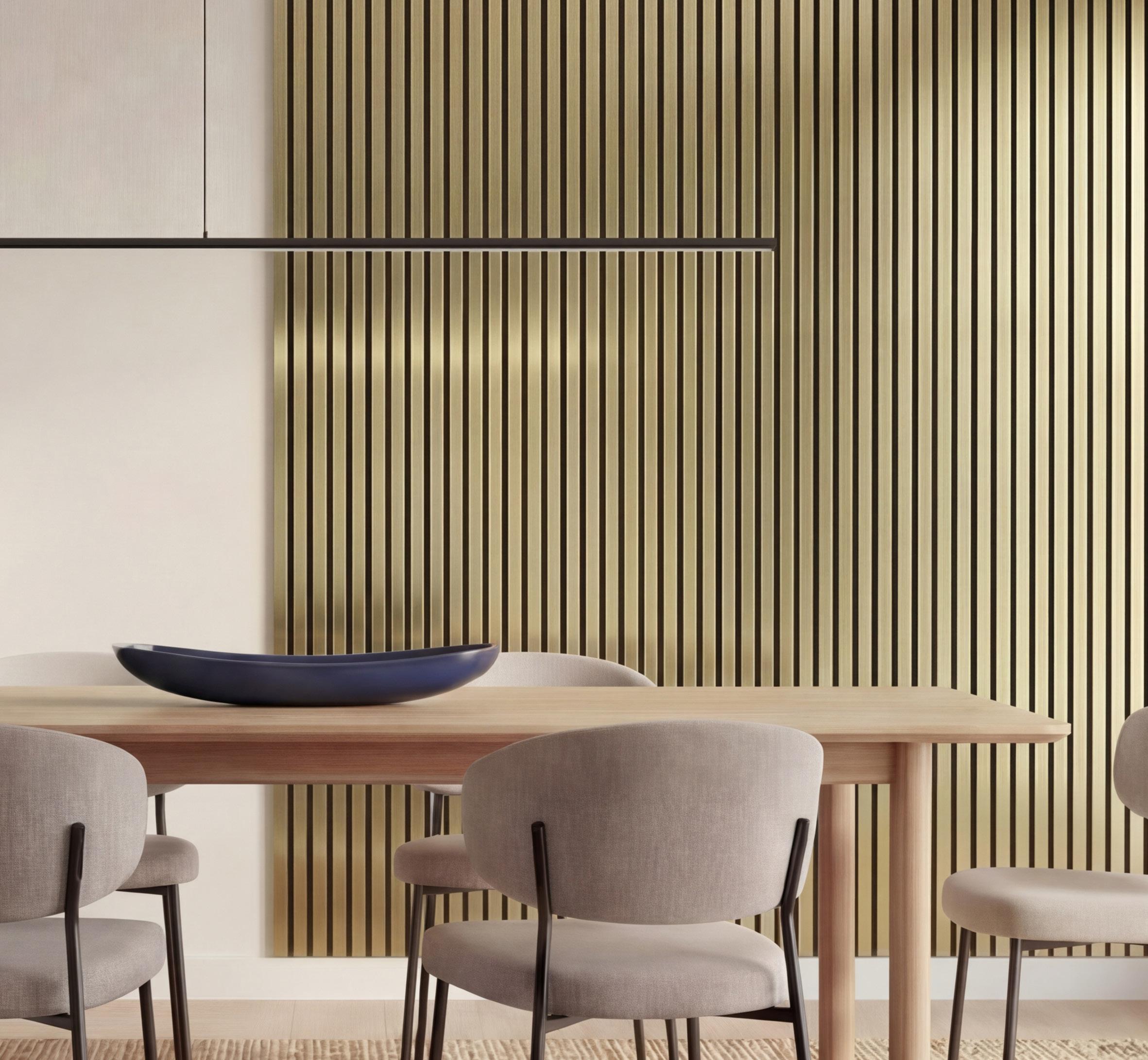 Metallic sont conçus pour créer une esthétique élégante et exclusive dans vos environnements intérieurs — tout en améliorant l’acoustique et la sensation de calme dans la pièce. Les panneaux présentent une surface stratifiée durable avec un élégant effet acier brossé, combiné à une sélection de nuances métalliques modernes qui donnent à votre intérieur une touche contemporaine et unique.