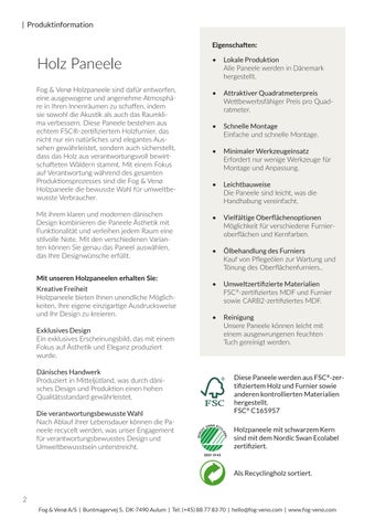 Fog & Venø Holzpaneele sind dafür entworfen, eine ausgewogene und angenehme Atmosphäre in Ihren Innenräumen zu schaffen, indem sie sowohl die Akustik als auch das Raumklima verbessern. Diese Paneele bestehen aus echtem FSC®-zertifiziertem Holzfurnier, das nicht nur ein natürliches und elegantes Aussehen gewährleistet, sondern auch sicherstellt, dass das Holz aus verantwortungsvoll bewirtschafteten Wäldern stammt. Mit einem Fokus auf Verantwortung während des gesamten Produktionsprozesses sind die Fog & Venø Holzpaneele die bewusste Wahl für umweltbewusste Verbraucher.