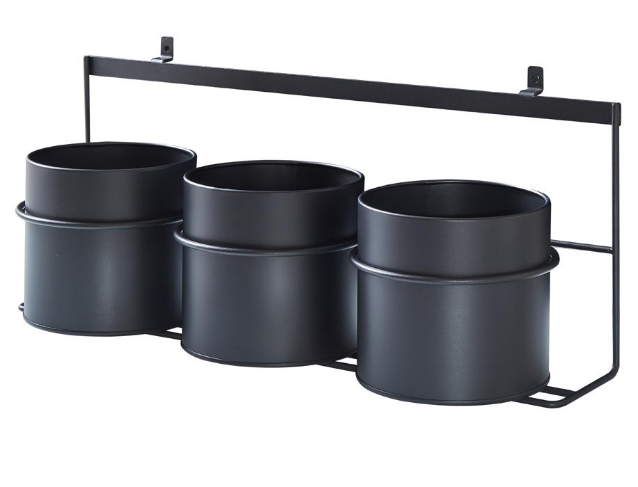 Zestaw trzech czarnych pojemników (Ø100 mm) z uchwytami i śrubami do łatwego montażu na panelach akustycznych. Idealny do organizowania drobiazgów w biurach, kuchniach i kreatywnych przestrzeniach.