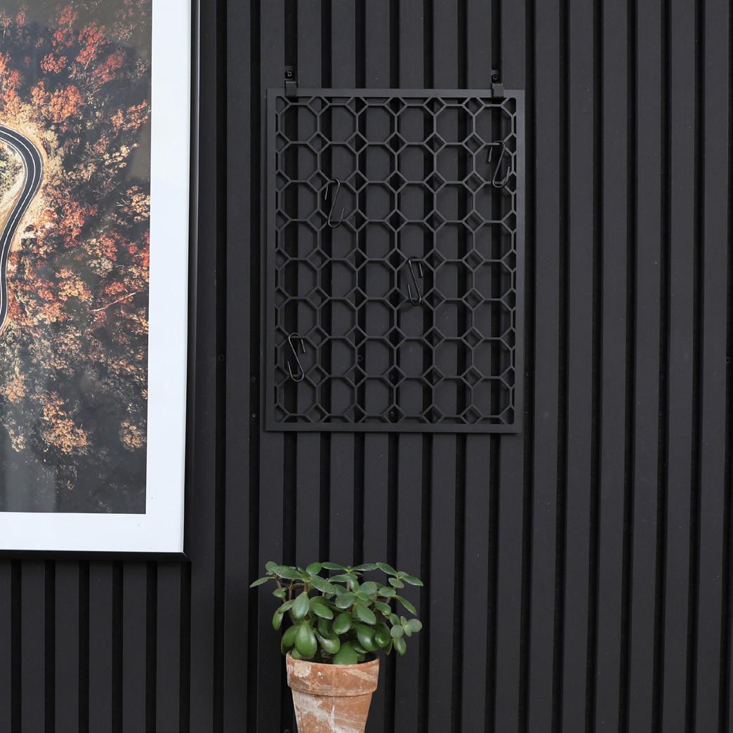 Elegancka czarna kratka do przechowywania z czterema haczykami, zaprojektowana do montażu na panelach akustycznych. Idealna do organizacji niezbędnych rzeczy w biurach, kuchniach i przedpokojach. Zawiera śruby do łatwego montażu.