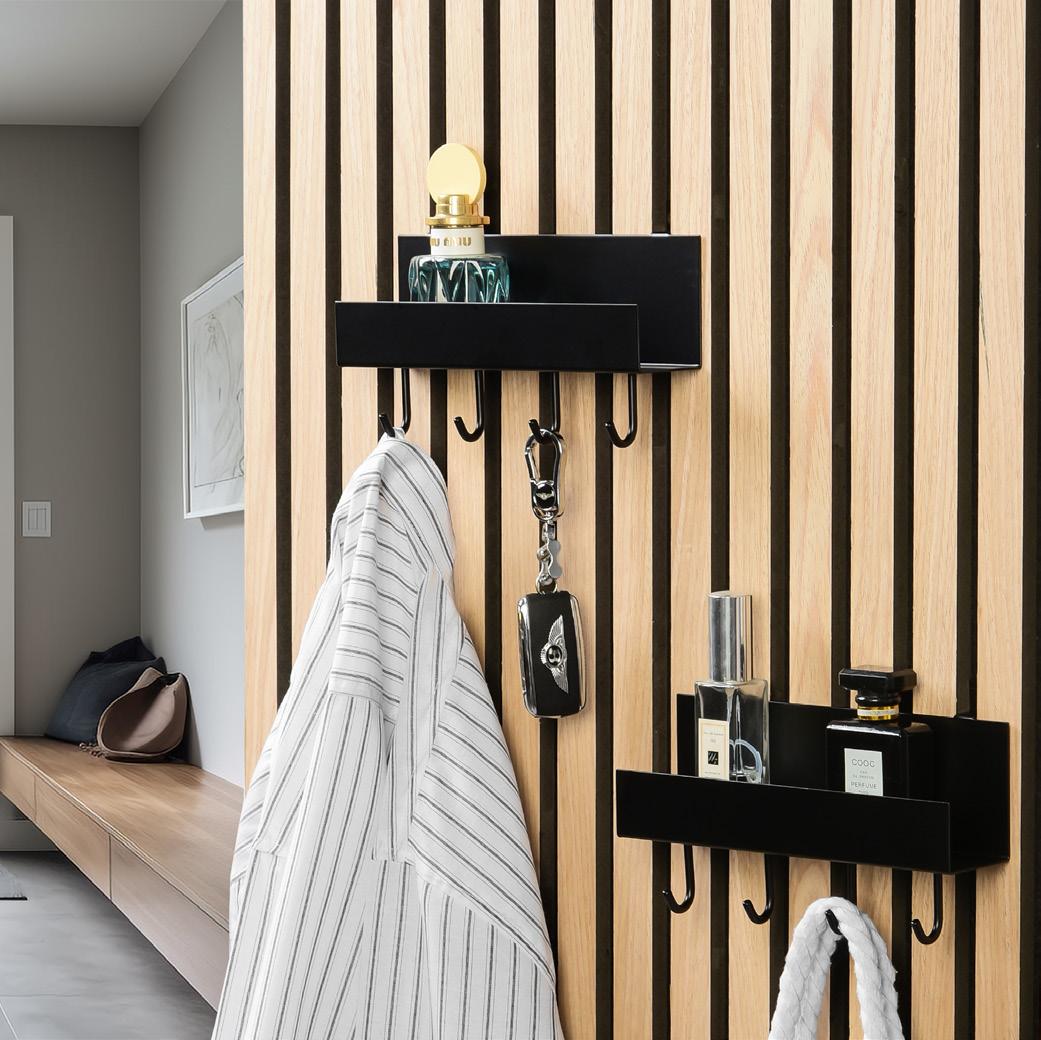 Elegancka czarna półka z pięcioma solidnymi haczykami, zaprojektowana do łatwego montażu na panelach akustycznych. Idealna do przechowywania niezbędnych rzeczy w przedpokojach, kuchniach lub biurach. W zestawie śruby montażowe.