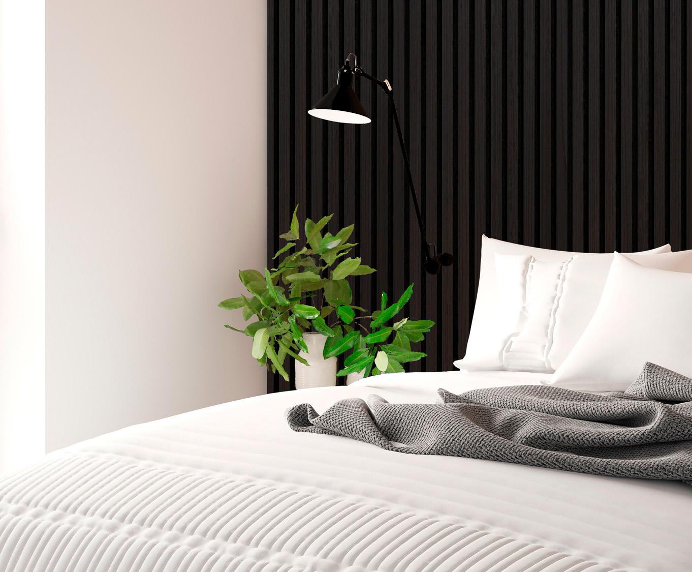 Sovrum med gavelvägg. Den svarta bakgrunden säkerställer en enhetlig och lugn bild, samtidigt som lamellstrukturen skapar liv och värme.