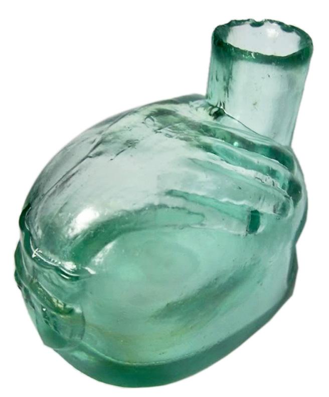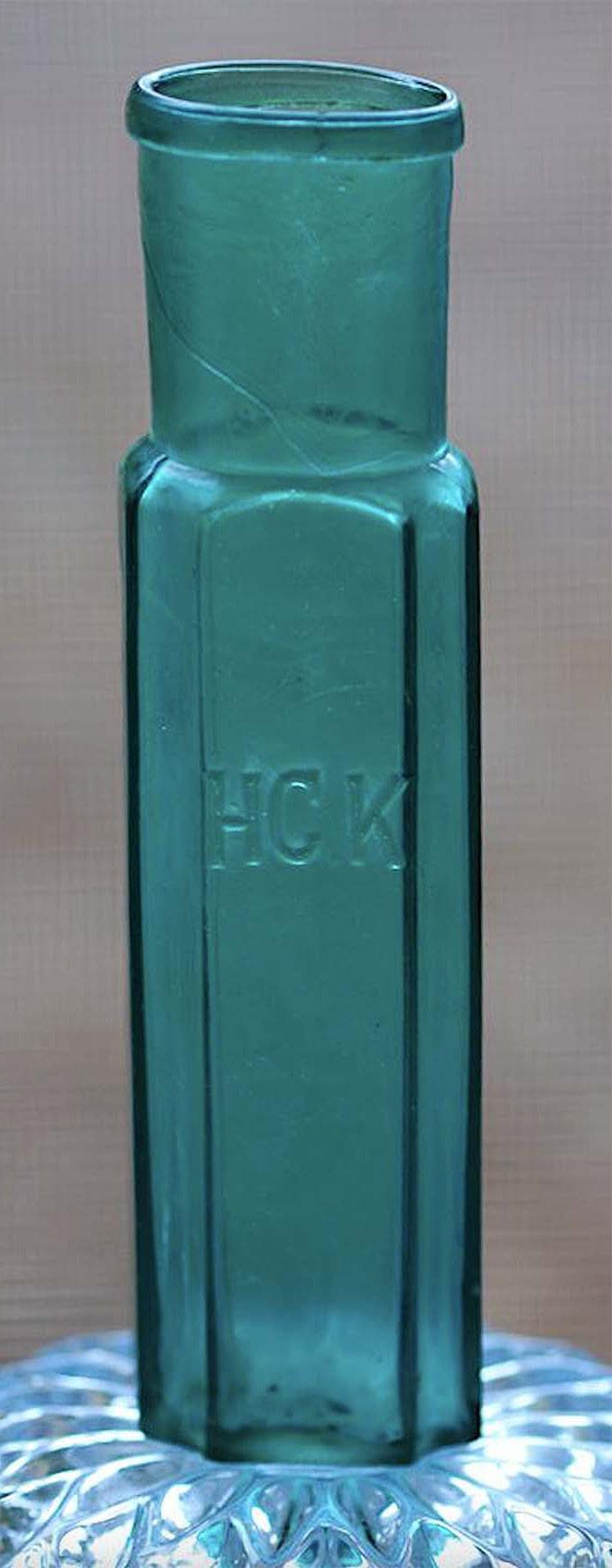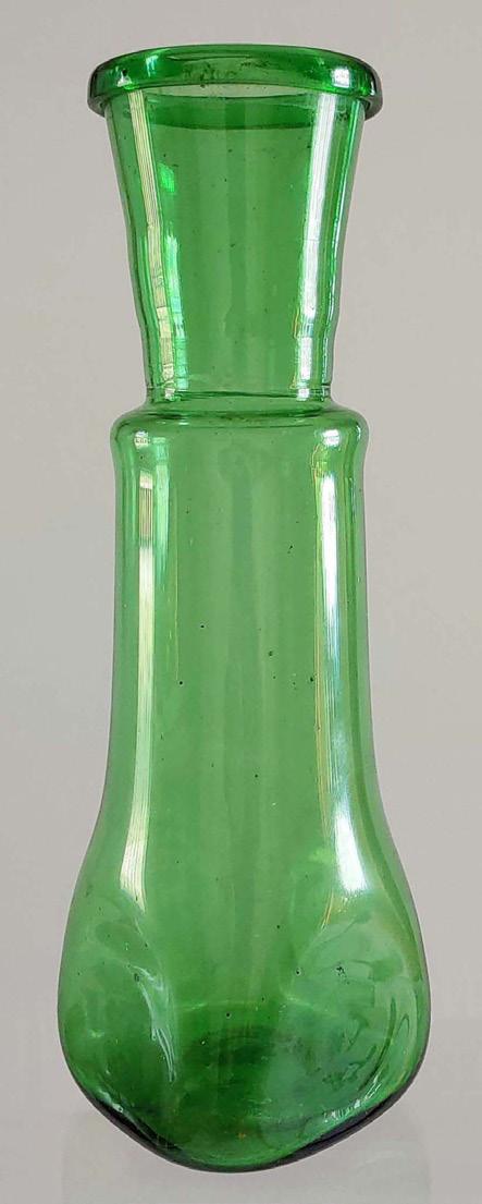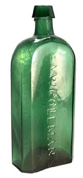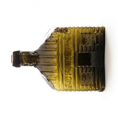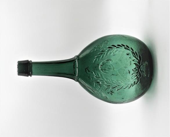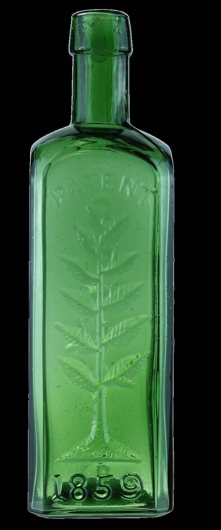 Lot 172: “ST / DRAKE’S / 1860 / PLANTATION / X / BITTERS - PATENTED / 1862”, (Ring/Ham, D-105), New York, ca. 1862 - 1875, medium moss green cabin, 9 7/8”h, smooth base, applied tapered collar mouth. Recently ‘picked’ at the ‘Elephant Trunk’ flea market in Connecticut (a favored venue of the ‘Flea Market Flip’ reality television show), and possibly only the second known example in this very unusual moss green color. In 1993 we auctioned the collection of Elmer Smith of Shelton, Washington. Lot 20 in that collection was at that time the only moss green Drake’s Plantation Bitters known to exist, it sold for $10,000!