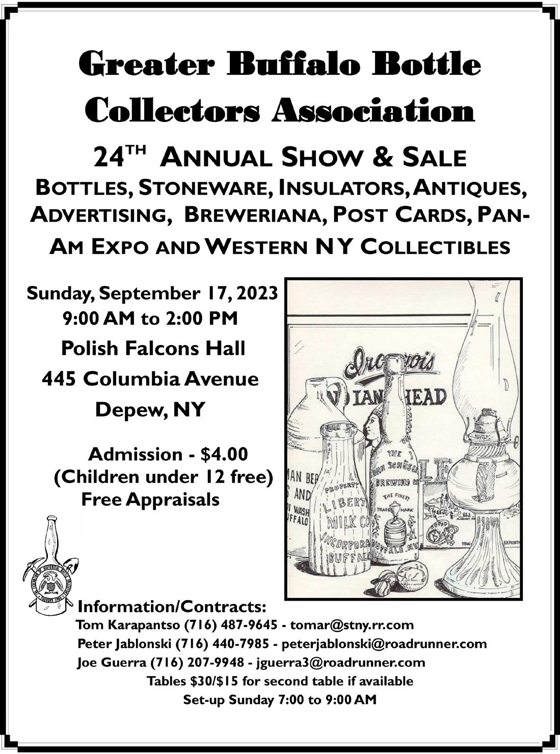 Findlay Antique Bottle Club Antique Bottle & Collectibles Show & Sale, Hancock County Fairgrounds, 1017 E. Sandusky St., Findlay, Ohio, 9 am to 2 pm $5, Early Bird Sunday 7 am to 9 am $20 (Dealer-only set up Saturday) Contact: Fred Curtis 419.424.0486, finbotclub@gmail.com Details and Contract Online, FOHBC Member Club