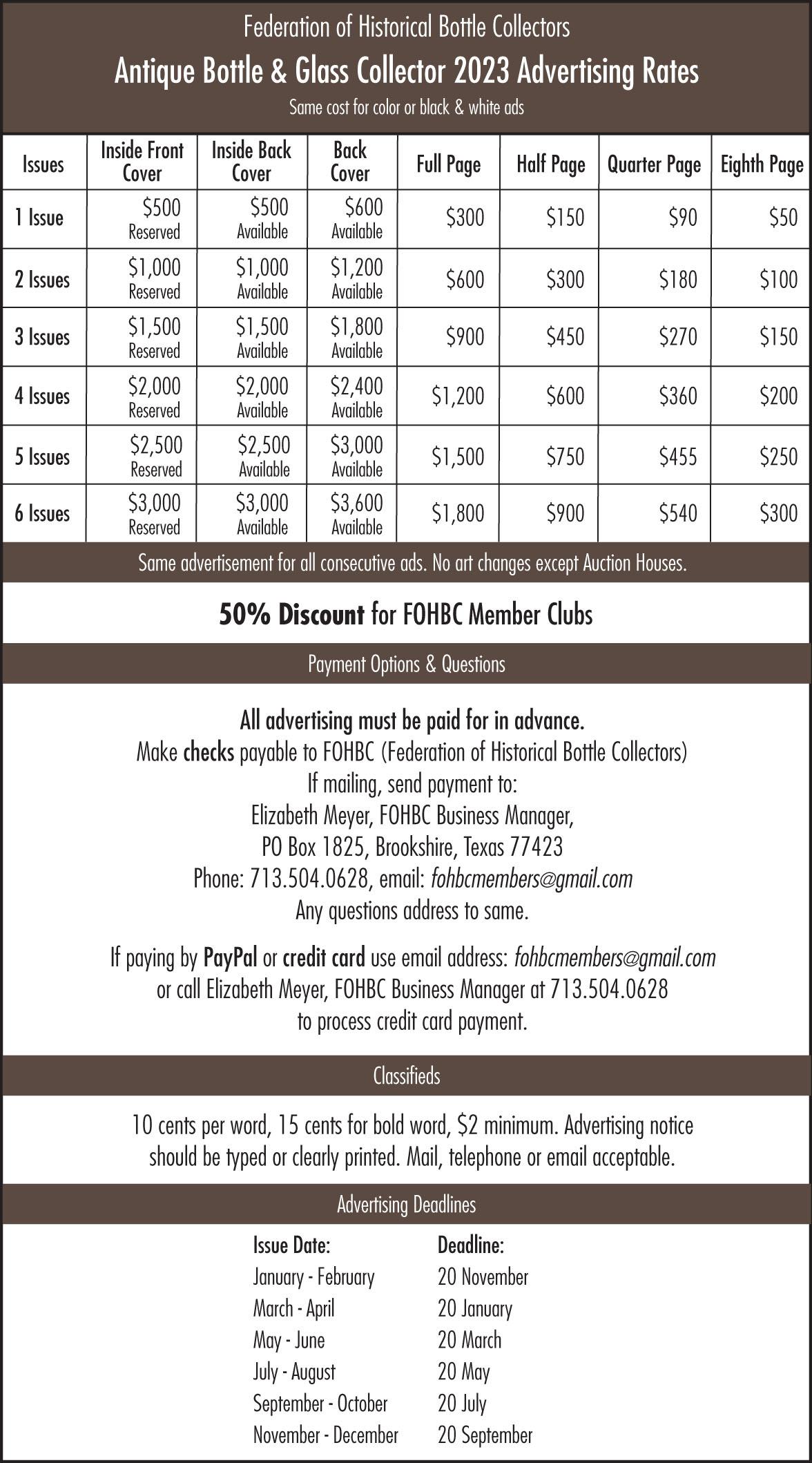 Annual subscription rate is: $40 for standard mail or $55 for First Class, $60 to Canada, $80 Other countries, $25 Digital Membership [in U.S. funds.] Life Membership: Level 1: $1,000, Level 2: $500. The Federation of Historical Bottle Collectors, Inc. (FOHBC) assumes no responsibility for products and services advertised in this publication. See page 72 for details.