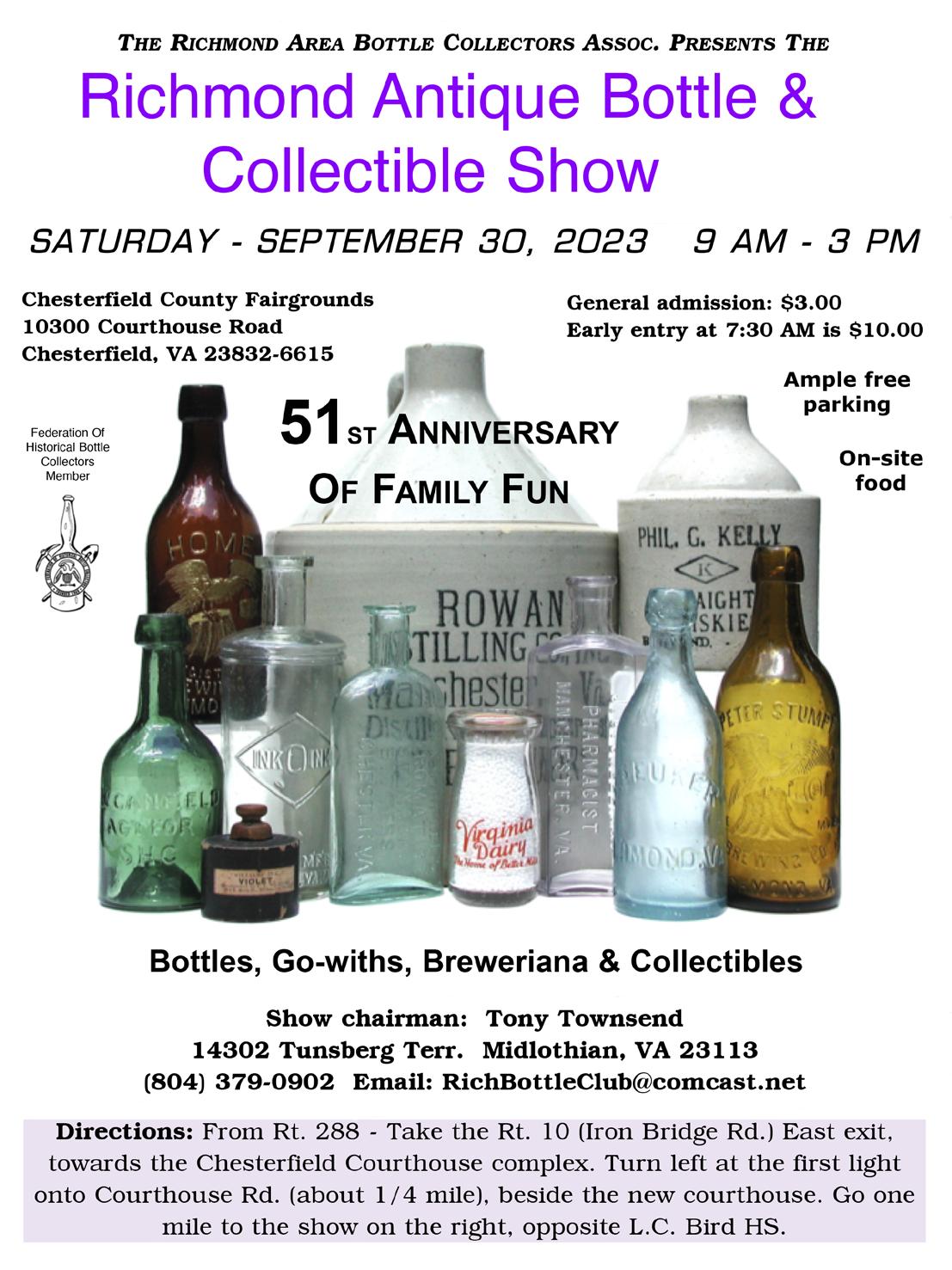 The Richmond Area Bottle Collectors Assoc. presents the 51st Richmond Antique Bottle and Collectibles Show and Sale; General Admission is $3, 9:00 am to 3:00 pm; Early Admission is $10 from 7:30 am, at the Chesterfield County Fairgrounds, 10300 Courthouse Road, Chesterfield, Virginia 23832. Info: Tony Townsend, 804.379-0902; RichBottleClub@comcast.net, FOHBC Member Club