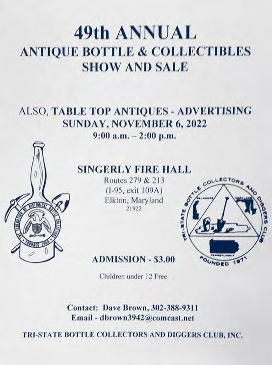 This September there were shows galore and October’s schedule ensures it will be a great month also. The bottle-collecting hobby is getting back on track after Covid wreaked havoc on everyone. From what I am seeing, there is a lot of enthusiasm! Make sure you read our expanded Regional News on page 9.