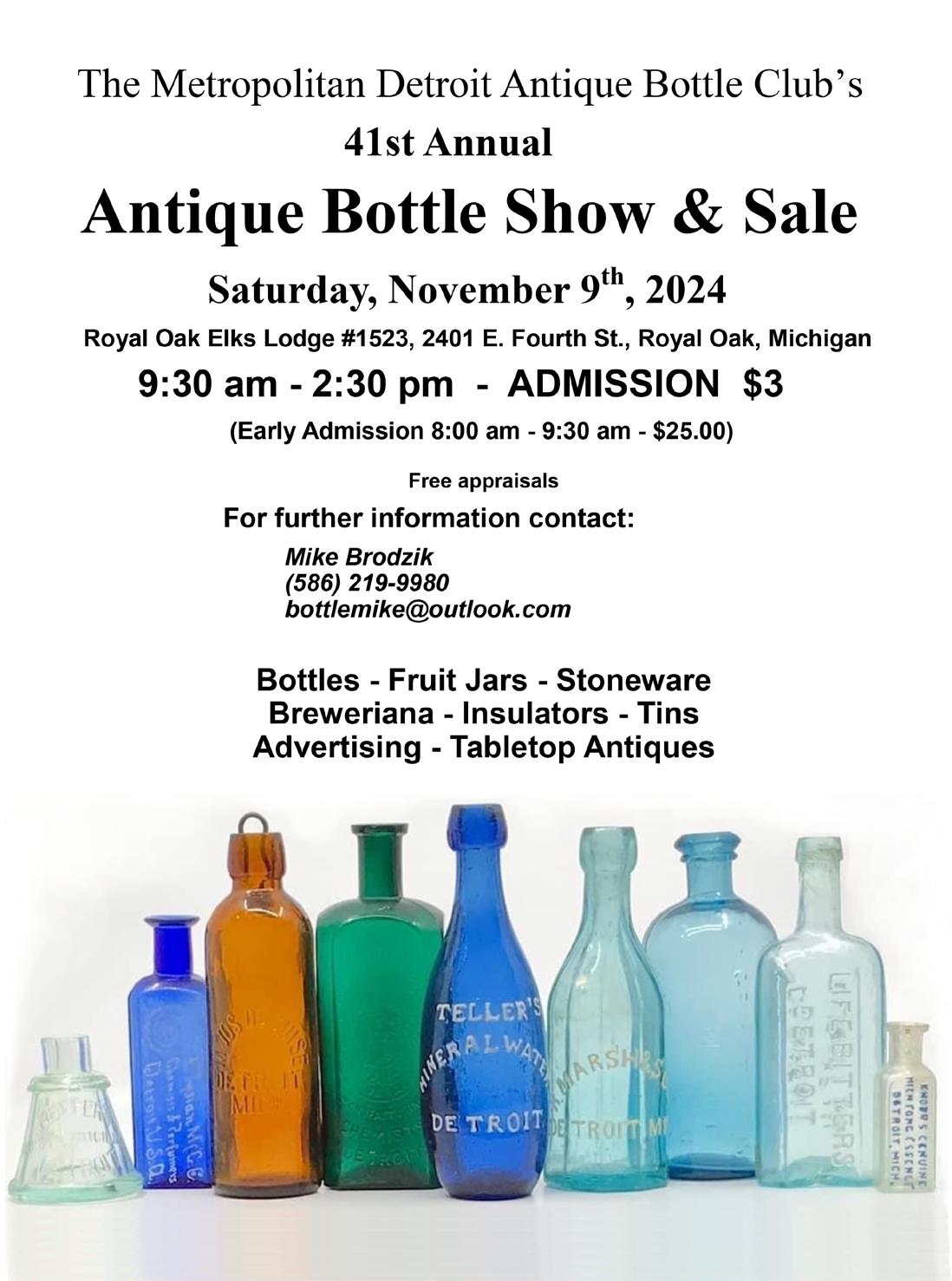 The Metropolitan Detroit Antique Bottle Club’s 41st Annual Antique Bottle Show & Sale, 9:30 am to 2:30 pm, Admission $3, Early Admission 8:00 to 9:30 am $25. Free Appraisals! Royal Oak Elks Lodge #1523, 2401 E. Fourth Street, Royal Oak, Michigan 48067, Contact: Mike Brodzik, Club President and Show Chairman, 586.219.9980, bottlemike@outlook.com, FOHBC Member Club