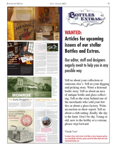 WANTED: Articles for upcoming issues of our stellar Bottles and Extras. Our editor, staff and designers eagerly await to help you in any possible way. Tell us about your collection or someone else’s. Tell us your digging and picking story. Write a fictional bottle story. Tell us about an area of antique bottle and glass collecting. Tell us the story behind one of the merchants who sold your bottles or about a glass factory. Write an auction or show report. Tell us about a club outing. Really, the sky is the limit. Don’t be shy. Young or old, new to the hobby or a veteran, please step forward. Thank You! To submit a Story, Send a Letter to the Editor, or have Comments and Concerns about Bottles and Extras, please contact the Editor, Martin Van Zant. mdvanzant@yahoo.com