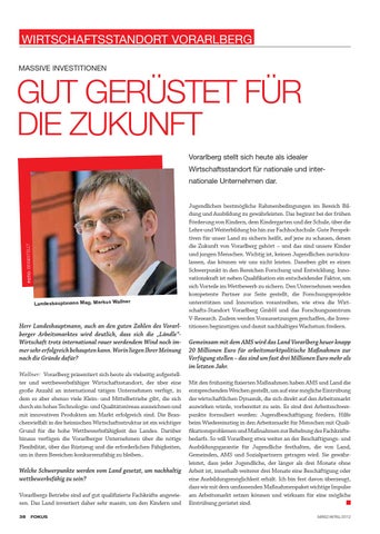Jugendlichen bestmögliche Rahmenbedingungen im Bereich Bildung und Ausbildung zu gewährleisten. Das beginnt bei der frühen Förderung von Kindern, dem Kindergarten und der Schule, über die Lehre und Weiterbildung bis hin zur Fachhochschule. Gute Perspektiven für unser Land zu sichern heißt, auf jene zu schauen, denen die Zukunft von Vorarlberg gehört – und das sind unsere Kinder und jungen Menschen. Wichtig ist, keinen Jugendlichen zurückzulassen, das können wir uns nicht leisten. Daneben gibt es einen Schwerpunkt in den Bereichen Forschung und Entwicklung. Innovationskraft ist neben Qualifikation ein entscheidender Faktor, um sich Vorteile im Wettbewerb zu sichern. Den Unternehmen werden kompetente Partner zur Seite gestellt, die Forschungsprojekte unterstützen und Innovation vorantreiben, wie etwa die Wirtschafts-Standort Vorarlberg GmbH und das Forschungszentrum V-Research. Zudem werden Voraussetzungen geschaffen, die Investitionen begünstigen und damit nachhaltiges Wachstum fördern. Gemeinsam mit dem AMS wird das Land Vorarlberg heuer knapp 20 Millionen Euro für arbeitsmarktpolitische Maßnahmen zur Verfügung stellen – das sind um fast drei Millionen Euro mehr als im letzten Jahr. Mit den frühzeitig fixierten Maßnahmen haben AMS und Land die entsprechenden Weichen gestellt, um auf eine mögliche Eintrübung der wirtschaftlichen Dynamik, die sich direkt auf den Arbeitsmarkt auswirken würde, vorbereitet zu sein. Es sind drei Arbeitsschwerpunkte formuliert worden: Jugendbeschäftigung fördern, Hilfe beim Wiedereinstieg in den Arbeitsmarkt für Menschen mit Qualifikationsproblemen und Maßnahmen zur Behebung des Fachkräftebedarfs. So will Vorarlberg etwa weiter an der Beschäftigungs- und Ausbildungsgarantie für Jugendliche festhalten, die von Land, Gemeinden, AMS und Sozialpartnern getragen wird. Sie gewährleistet, dass jeder Jugendliche, der länger als drei Monate ohne Arbeit ist, innerhalb weiterer drei Monate eine Beschäftigung oder eine Ausbildungsmöglichkeit erhält. Ich bin fest davon überzeugt, dass wir mit dem umfassenden Maßnahmenpaket wichtige Impulse am Arbeitsmarkt setzen können und wirksam für eine mögliche Eintrübung gerüstet sind. Q MÄRZ/APRIL/2012