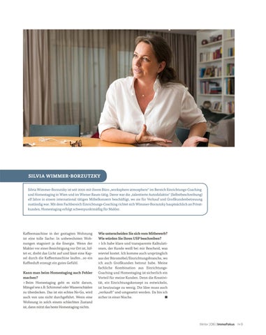 SILVIA WIMMER-BORZUTZKY Silvia Wimmer-Borzutzky ist seit 2001 mit ihrem Büro „worksphere atmosphere“ im Bereich Einrichtungs-Coaching und Homestaging in Wien und im Wiener Raum tätig. Davor war die „talentierte Autodidaktin“ (Selbstbeschreibung) elf Jahre in einem international tätigen Möbelkonzern beschäftigt, wo sie für Verkauf und Großkundenbetreuung zuständig war. Mit dem Fachbereich Einrichtungs-Coaching richtet sich Wimmer-Borzutzky hauptsächlich an Privatkunden, Homestaging erfolgt schwerpunktmäßig für Makler.