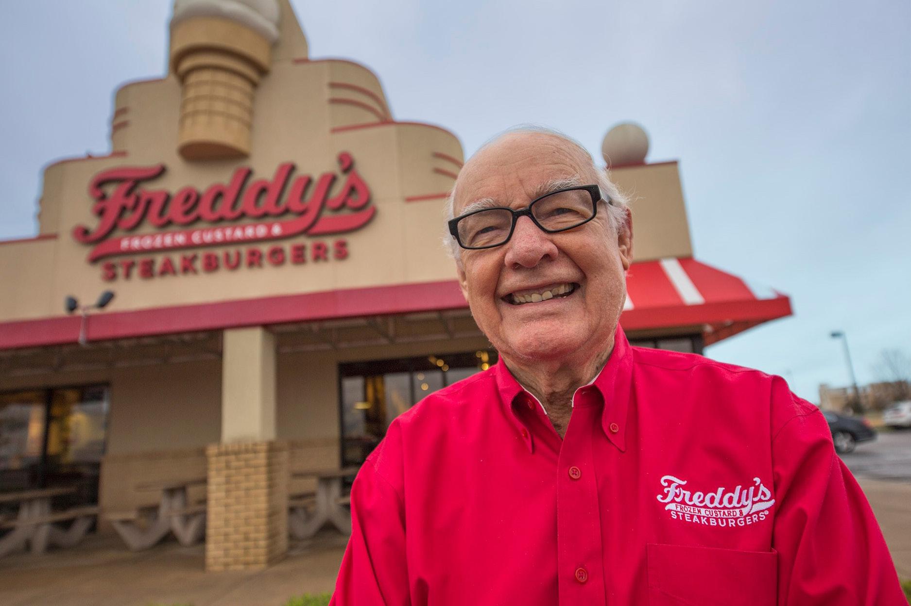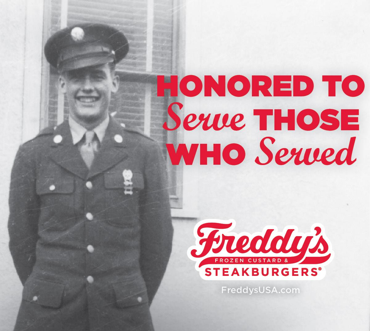 The passion at Freddy’s Frozen Custard runs much deeper than the delicious treats featured on menus across America. What many people may not know is the founder of Freddy’s, Frederick “Freddy” Louis Simon, was a devoted patriot, proud American, and decorated veteran of the United States Army. A recipient of many awards, including the Bronze Star and Purple Heart, Freddy remained committed to passionate patriotism long after he was honorably discharged from the military in 1945 - frequently speaking to schools and organizations about his time in the service and the price of freedom