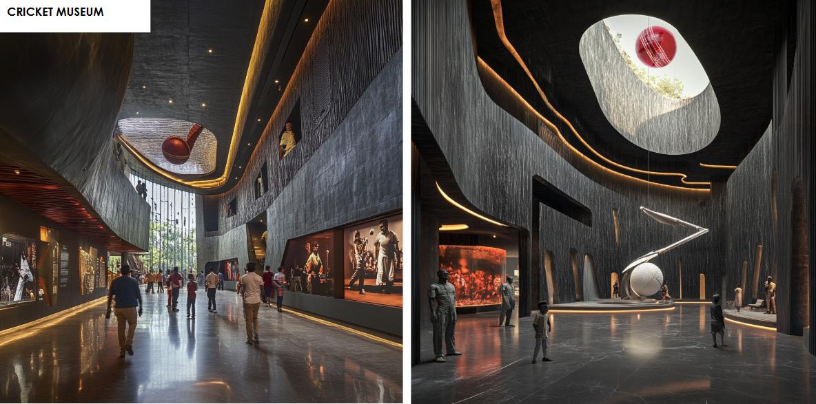 At its heart lies a central courtyard, framed by contemporary terraces and infused with art— holographic cricket installations, Sudhir Patwardhaninspired murals, and sculptures that celebrate the game’s legacy. The interiors blend fort-like solidity with modern fluidity, using curvilinear parapets, stepped platforms, and open terraces to create dynamic spaces for players and visitors alike.