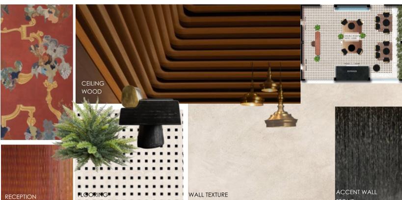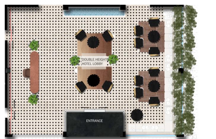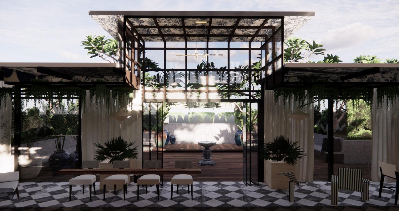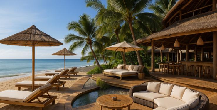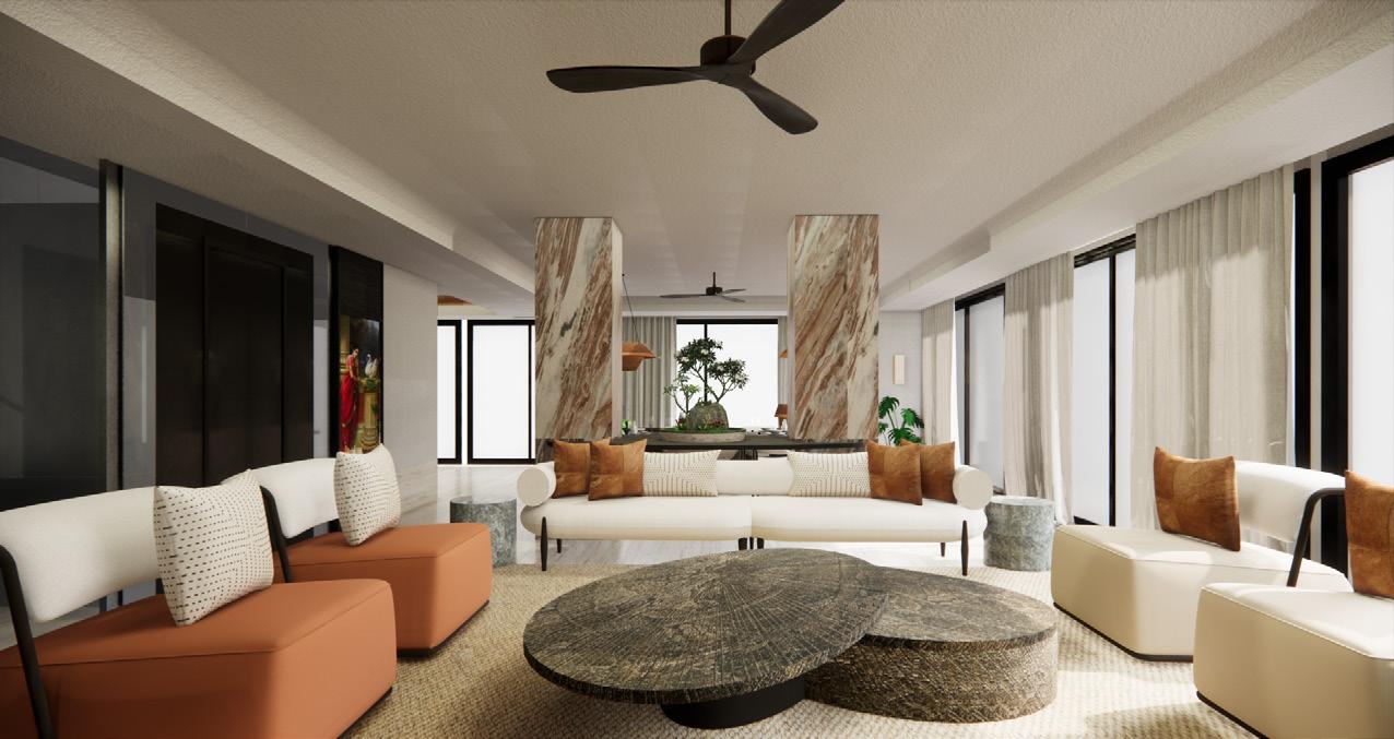 The resort includes a hotel lobby, banquet hall, beach café, yoga pavilion, and private stays. The lobby sets the tone with a dramatic timber ceiling, a tranquil water feature, and brass pendant lights reminiscent of coastal lanterns. Warm textures—rippling wood, sculptural furniture, and patterned stone flooring— blend artistry and comfort from the very first step.
