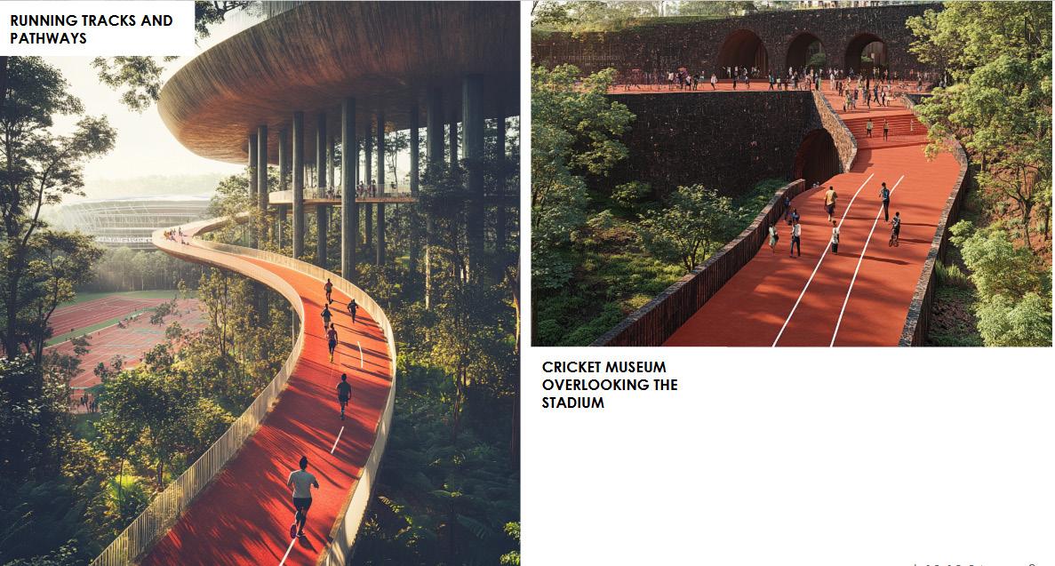 The clubhouse overlooks the domed stadium, its elevated running track weaving through treetops like a pathway through a historic stronghold. The VIP entrance, inspired by Ajanta and Ellora caves, welcomes guests into a realm where tradition and innovation merge. From training zones with immersive simulations to a floating museum showcasing cricket’s evolution, every element of this clubhouse is a testament to the game’s enduring legacy and Maharashtra’s architectural heritage.