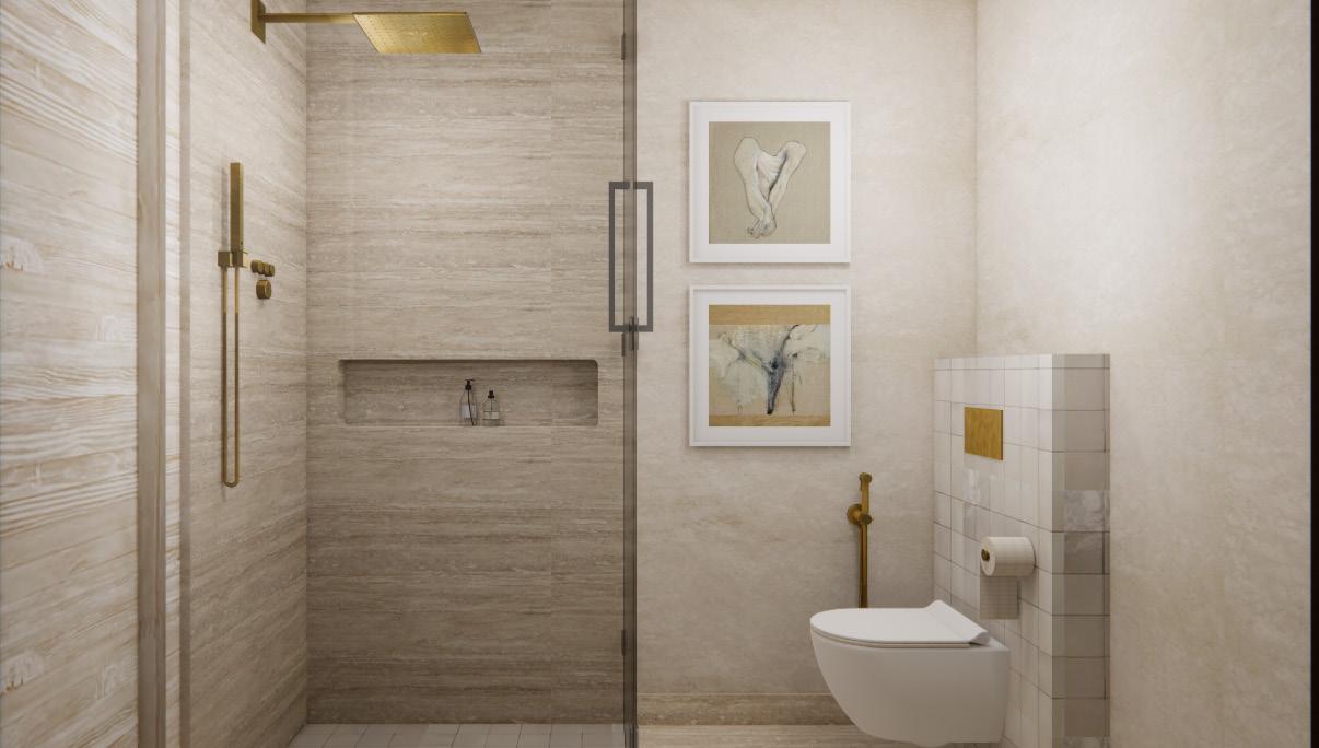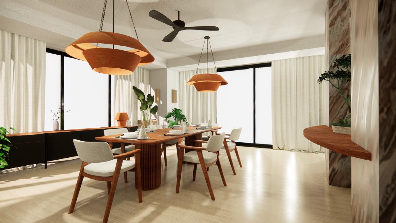 Colour is used sparingly but with purpose— playful and artistic pops that reveal themselves slowly, like a story unfolding. At the far end of the apartment, framed by an arched entry, a dramatic, cosy dining nook glows under a striking light installation—one of many carefully curated moments.