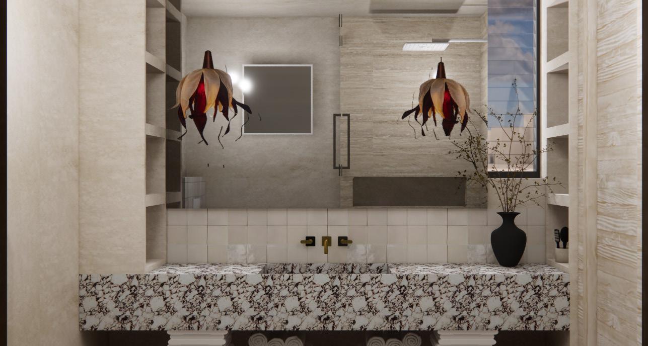 Where the scent of wet earth meets the softness of pearls— a bath, a shrine, a return to self. In this tiled sanctum, the feminine rests, luxuriates, remembers.