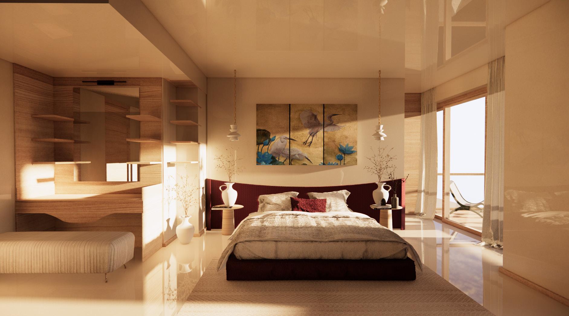 A space where elegance meets intrigue — koi swimming behind a sculpted headboard, soft lights above, and a goddess keeping secrets close. Design that invites curiosity, calm, and a little drama.