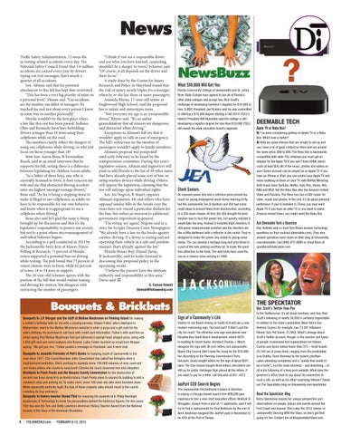 News Traffic Safety Administration, 11 teens die in texting-related accidents every day. The National Safety Council found that 1.6 million accidents are caused every year by drivers typing out text messages; that’s nearly a quarter of all accidents. Sen. Altman said that his personal attachment to this bill has kept him motivated. “This has been a very big priority of mine on a personal level,” Altman said. “Car accidents are the number one killer of teenagers. It’s touched me and just about every person I know in some way or another personally.” Florida wouldn’t be the first place where a law like this one has been passed. Indiana, Ohio and Kentucky have laws forbidding drivers younger than 18 from using their cellphones while on the road. The numbers clearly reflect the dangers of using our cellphones while driving, so why just focus on those younger than 18? State Sen. Aaron Bean, R-Fernandina Beach, said in an email interview that he supports the bill, noting there is a difference between legislating for children versus adults. “As a father of three boys, one who is currently licensed to drive, it does concern my wife and me that distracted driving accident rates are highest amongst teenage drivers,” Bean said. “As for it being a stepping stone to make it illegal to use cellphones, as adults we have to be responsible for our own behavior and know when it is appropriate to use a cellphone when driving.” Bean also said he’s glad the issue is being brought up for discussion and that it’s the legislators’ responsibility to protect our society, but not to a point where micromanagement of individual behavior begins. According to a poll conducted in 2011 by the Jacksonville-born firm of Mason-Dixon Polling & Research, 71 percent of Florida voters supported a potential ban on driving while texting. The poll found that 77 percent of senior citizens were in favor, while 62 percent of voters 18 to 34 were in support. The 16-year-old Schemer agrees with the portion of the bill that would outlaw texting and driving for minors, but disagrees with restricting the number of passengers.