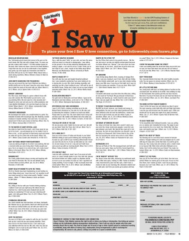 To place your free I Saw U love connection, go to folioweekly.com/isawu.php fax 904.260.9773 or snail mail ATTN: I Saw U Folio Weekly, 9456 Philips Hwy., Ste. 11, Jacksonville FL 32256
