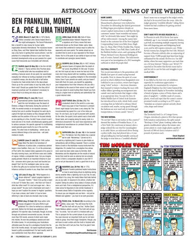NEWS OF THE WEIRD NAME GAMES Fourteen employees of a Framingham, Massachusetts, pharmacy were indicted in December for defrauding the federal government by filling bogus prescriptions (despite an owner’s explicit instructions to staff that the fake customers’ names “must resemble real names,” with “no obviously false names” that might tip off law enforcement). Among the names later found on the customer list of the New England Compounding Center were Baby Jesus, Hugh Jass, L.L. Bean, Filet O’Fish, Freddie Mac, Fannie Mae, Harry Potter, Coco Puff, Mary Lamb, all of the Baldwin brother actors, and a grouping of Bud Weiser, Richard Coors, Raymond Rollingrock and, of course, Samuel Adams. The indictments were part of an investigation of a 2012 meningitis outbreak in which 64 people died. CULTURAL DIVERSITY Two recent innovations to the generations-old Middle East sport of camel racing boosted its profile. First, to cleanse the sport of a sour period in which children from Bangladesh were trafficked to use as jockeys, owners have begun using “robot” jockeys — electronic dummies that respond to trainers tracking the races with walkie-talkies (growling encouragement into camels’ ears) and joysticks that trigger a whip at an appropriate time. Second, the firm Al Shibla Middle East of United Arab Emirates has introduced lycra-style, whole-body camel coverings that are believed to enhance blood circulation and, maybe, racing speed (though the fashions are now used only in training and transportation, to lessen camels’ “stress”). THE NEW NORMAL “It’s not fair! There is not justice in this country!” shouted the mother of Franklin Reyes, 17, in a New York City courtroom in January after a judge ordered the son tried for manslaughter as an adult. Reyes, an unlicensed driver fleeing a police traffic stop, had plowed into a 4-yearold girl, killing her, but had initially convinced the judge to treat him as a “youthful offender.”