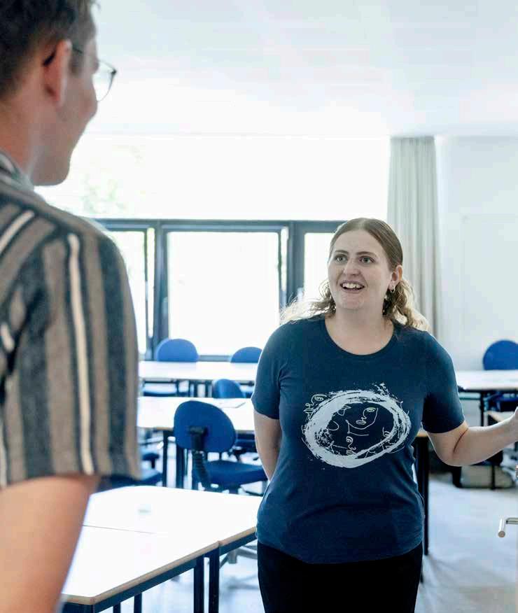 ”Det sværeste er faktisk, når I skal spille det modsatte køn,” siger hun og giver dem muligheden for at bytte. Men de studerende afslår.
