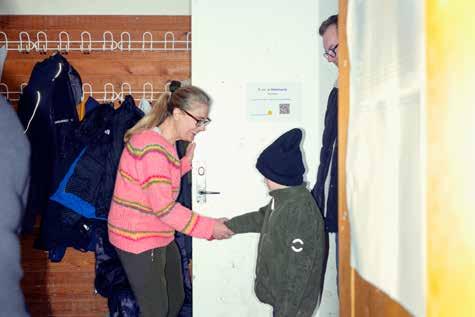 Til familiematematik er man naturligvis velkommen til at tage hele familien med. Matematiklærer og -vejleder Charlotte Tengstedt Hendriksen byder en af sine elevers søskende velkommen.