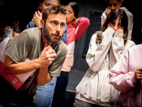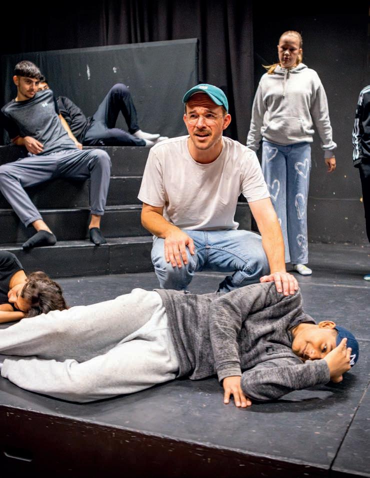 Mikkel Thorn Jensen springer energisk omkring på gulvet i skolens sortmalede teaterkælder. Hans stemme gjalder op til de elever, der står bagerst på scenen og er for generte eller nervøse til at knæle med hånden tænksomt under kinden.