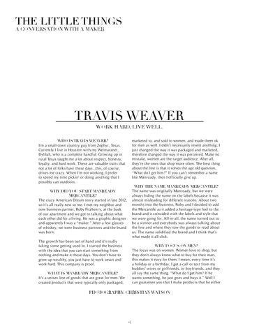 marketed to, and sold to women, and made them ok for men as well. I didn’t necessarily invent anything, I just changed the way it was packaged and marketed, therefore changed the way it was perceived. Make no mistake, women are the target audience. After all, they’re the ones that shop more often. The best thing about the line is that it solves the age old question, “What do I get him?” If you can’t remember a name like Manready, then I officially give up. WHY THE NAME MANREADY MERCANTILE? The name was originally Manready, but we were always hiding the name on the labels because it was almost misleading for different reasons. About two months into the business, Roby and I decided to add the Mercantile as it added a heritage-type feel to the brand and it coincided with the labels and style that we were going for. All-in-all, the name turned out to be a winner and everybody was always talking about the line and where they saw the goods or read about us. The name solidified the brand and I think that’s what made it all click.