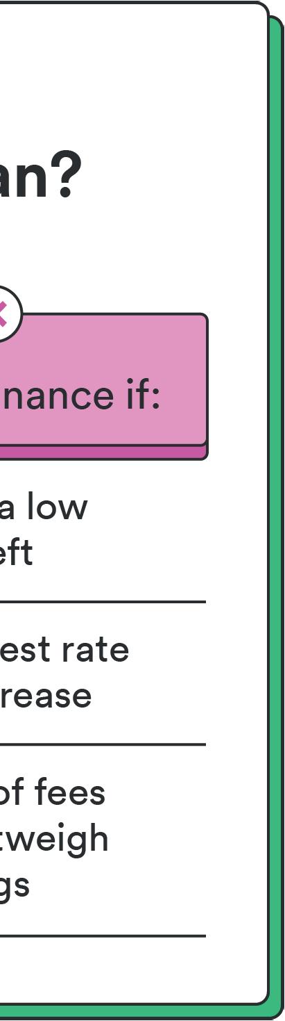 • Break-even point: Refinancing involves costs. These costs are paid with the rate you choose or added into the loan. You will need to calculate your break-even point (when savings offset expenses). If you plan to move soon, or refinance again soon, recouping those costs might be tricky.