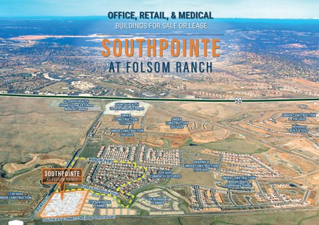 This shopping center has been discussed as being completed in early 2024, but no visible construction has begun yet. Located at East Bidwell Street and White Rock, with 315 parking spaces, 16 electric car charging spaces, and 31 bicycle spaces. Tenants include a gas station, Circle K, car wash, with spaces for two drive-throughs and 5 medical and dental offices as well as two retail spaces. An unnamed veterinary clinic and medical clinic have leased spaces already.
