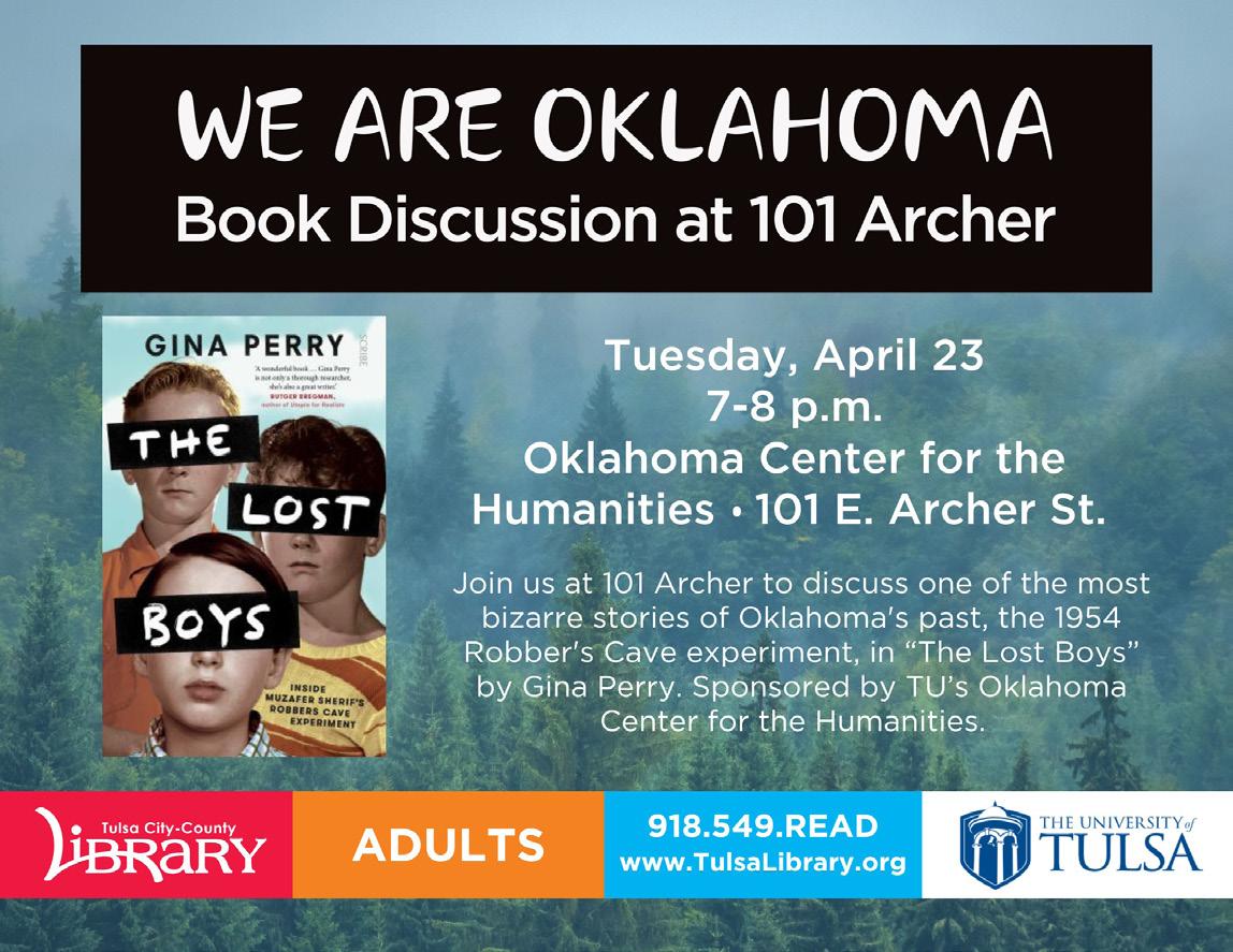 The next book will be The Lost Boys by Gina Perry, about a secret camping experiment at Robbers Cave State Park near McAlister, in the summer of 1954. Copies are available. The discussion will be held Tuesday, April 23 at the Oklahoma Center for the Humanities located at 101 E. Archer Street.
