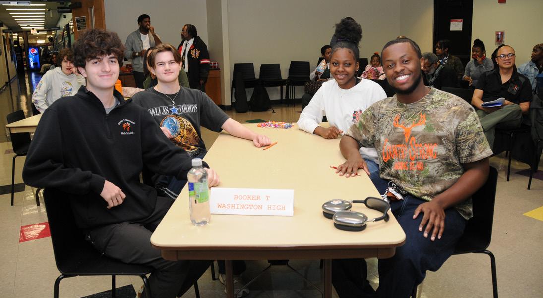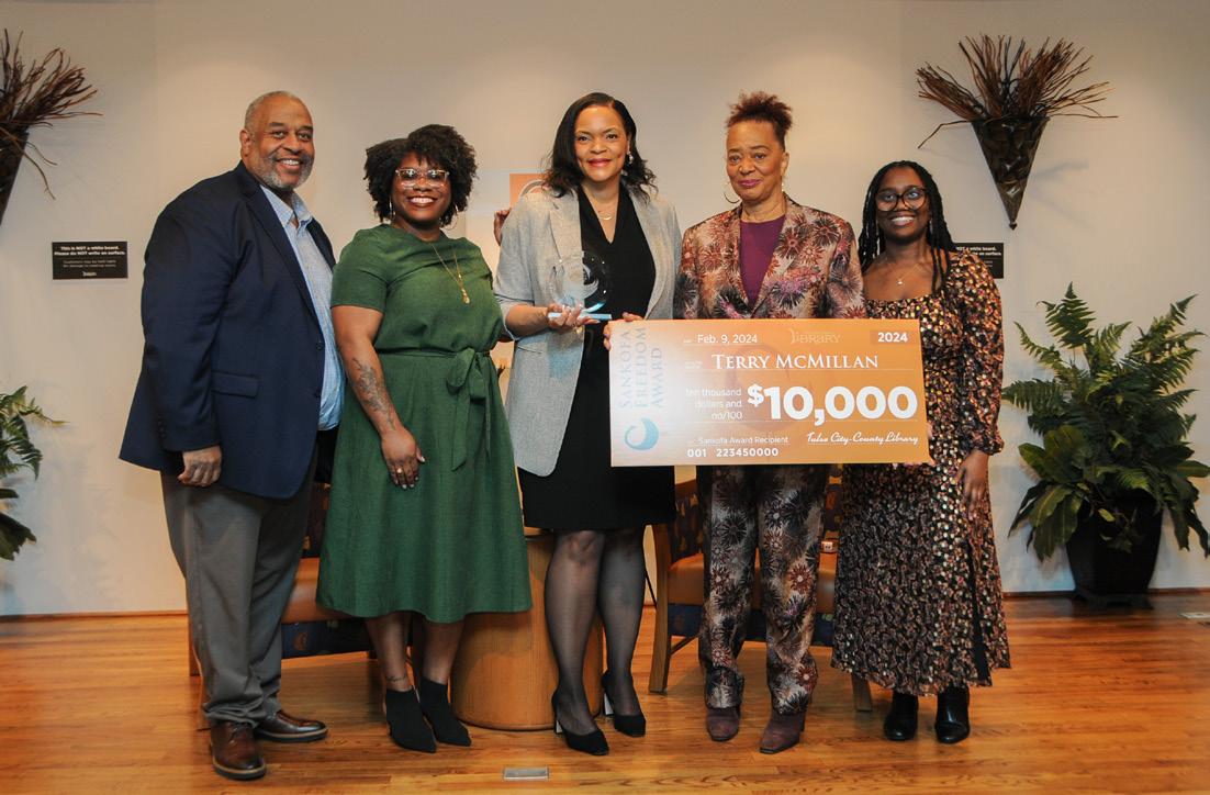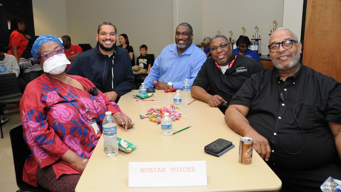 Clockwise from Top: The team from Booker T. Washington High School takes part in the African American Heritage Bowl; Library staff from the Nubian Voices Affinity Group formed a team for the Bowl; Terry McMillan signs books at the Sankofa Freedom Award event; McMillan with library CEO Kim Johnson and staff from Rudisill Regional Library and the African American Resource Center.
