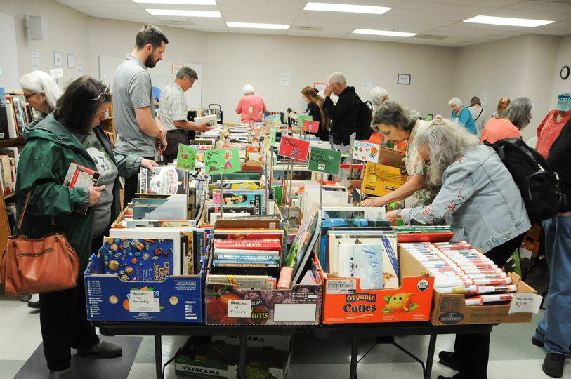Eager shoppers browse books at a Friends of the Helmerich Library Book Sale. The annual event, which returned last year after a pandemic pause, always draws a crowd to this Tulsa library.