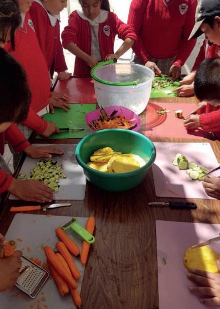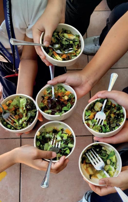 cualquier persona. Además, los estudiantes que participan en esta actividad aprenden y tienden a mostrar una mayor disposición a probar nuevas verduras y frutas, a crear ensaladas y a consumirlas, lo que puede traducirse en una dieta más equilibrada, variada y saludable que pueden compartir en casa con sus familias.