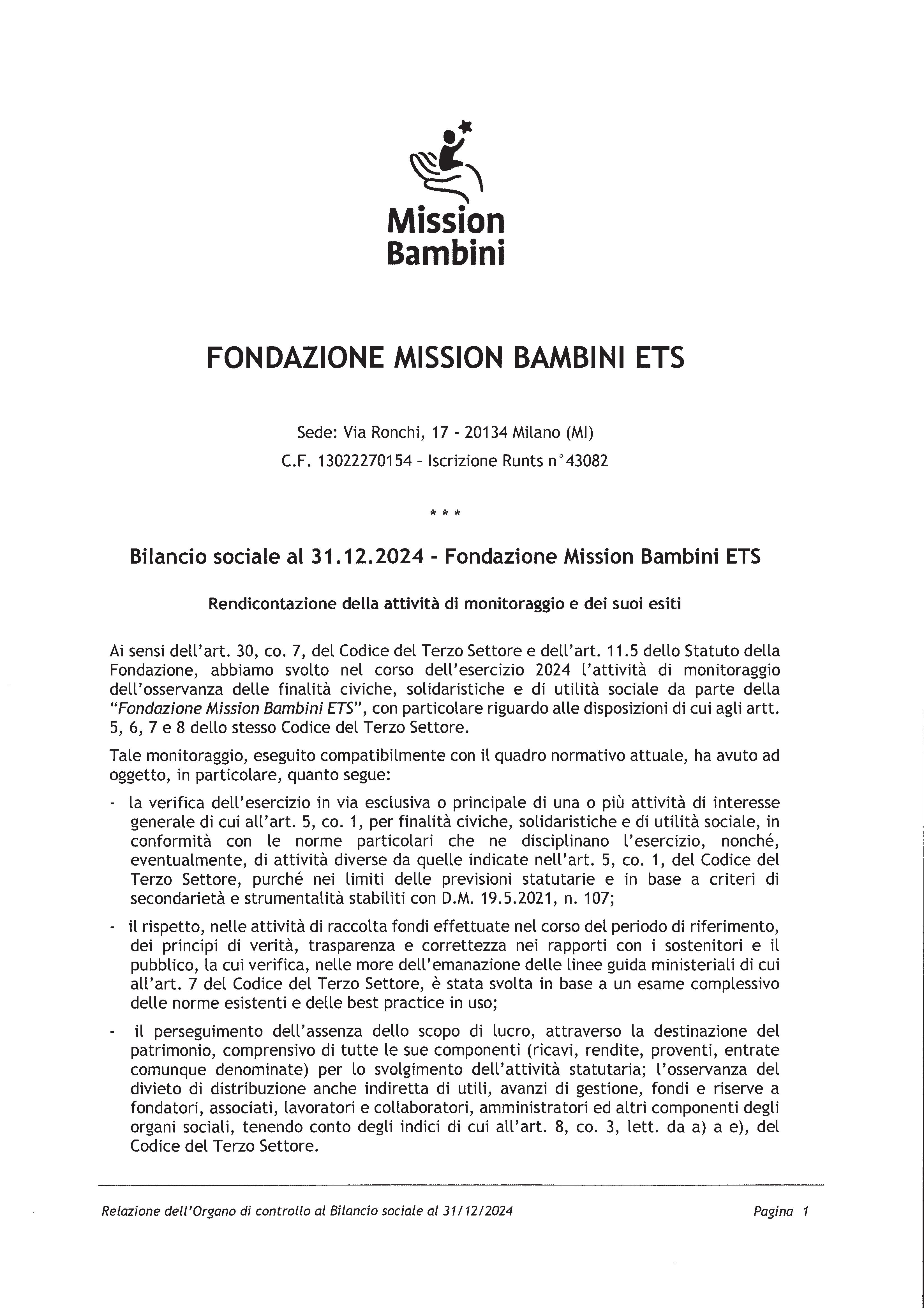 di seguito la relazione dell’Organo di controllo (Collegio Sindacale) circa l’osservanza delle norme e dello Statuto da parte di Mission Bambini per l’anno 2024.