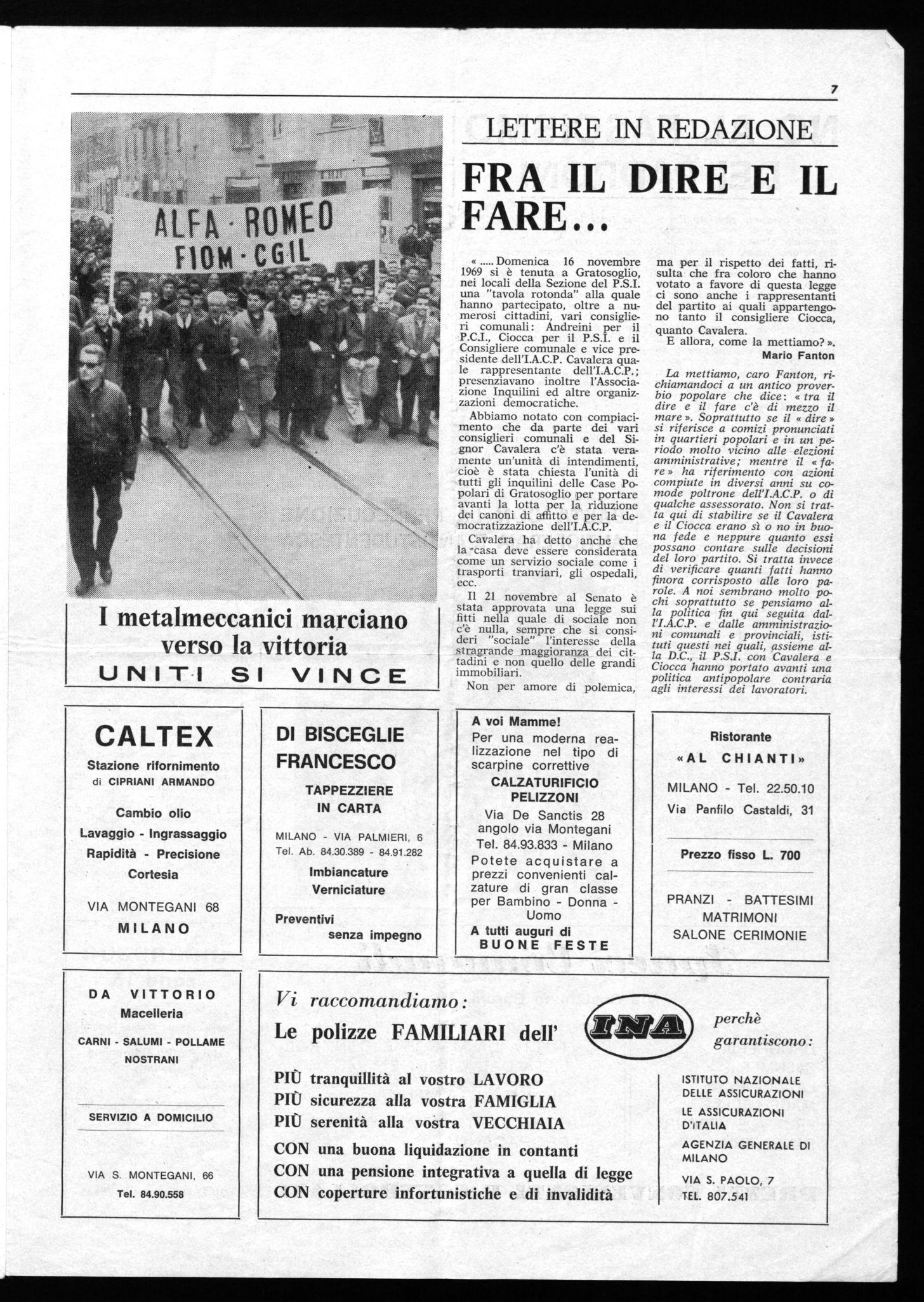 La mettiamo, caro Fanton, richiamandoci a un antico proverbio popolare che dice: « tra il dire e il fare c'è di mezzo il mare ». Soprattutto se il « dire » si riferisce a comizi pronunciati in quartieri popolari e in un periodo molto vicino alle elezioni amministrative; mentre il « fare» ha riferimento con azioni compiute in diversi anni su comode poltrone dell'I.A.C.P. o di qualche assessorato. Non si tratta qui di stabilire se il Cavalera e il Ciocca erano sì o no in buona fede e neppure quanto essi possano contare sulle decisioni del loro partito. Si tratta invece di verificare quanti fatti hanno finora corrisposto alle loro parole. A noi sembrano molto pochi soprattutto se pensiamo alla politica fin qui seguita dall'I.A.C.P. e dalle amministrazioni comunali e provinciali, istituti questi nei quali, assieme alla D.C., il P.S.I. con Cavalera e Ciocca hanno portato avanti una politica antipopolare contraria agli interessi dei lavoratori.