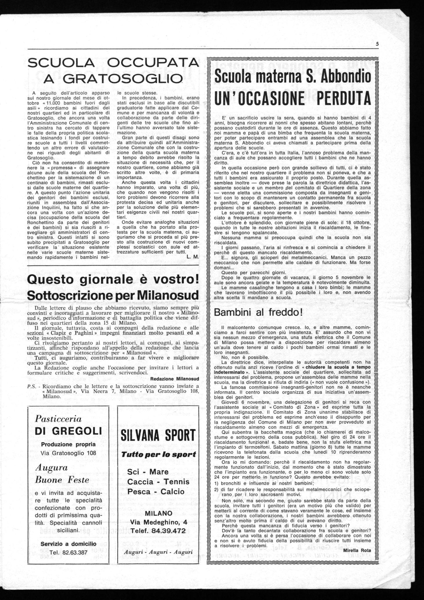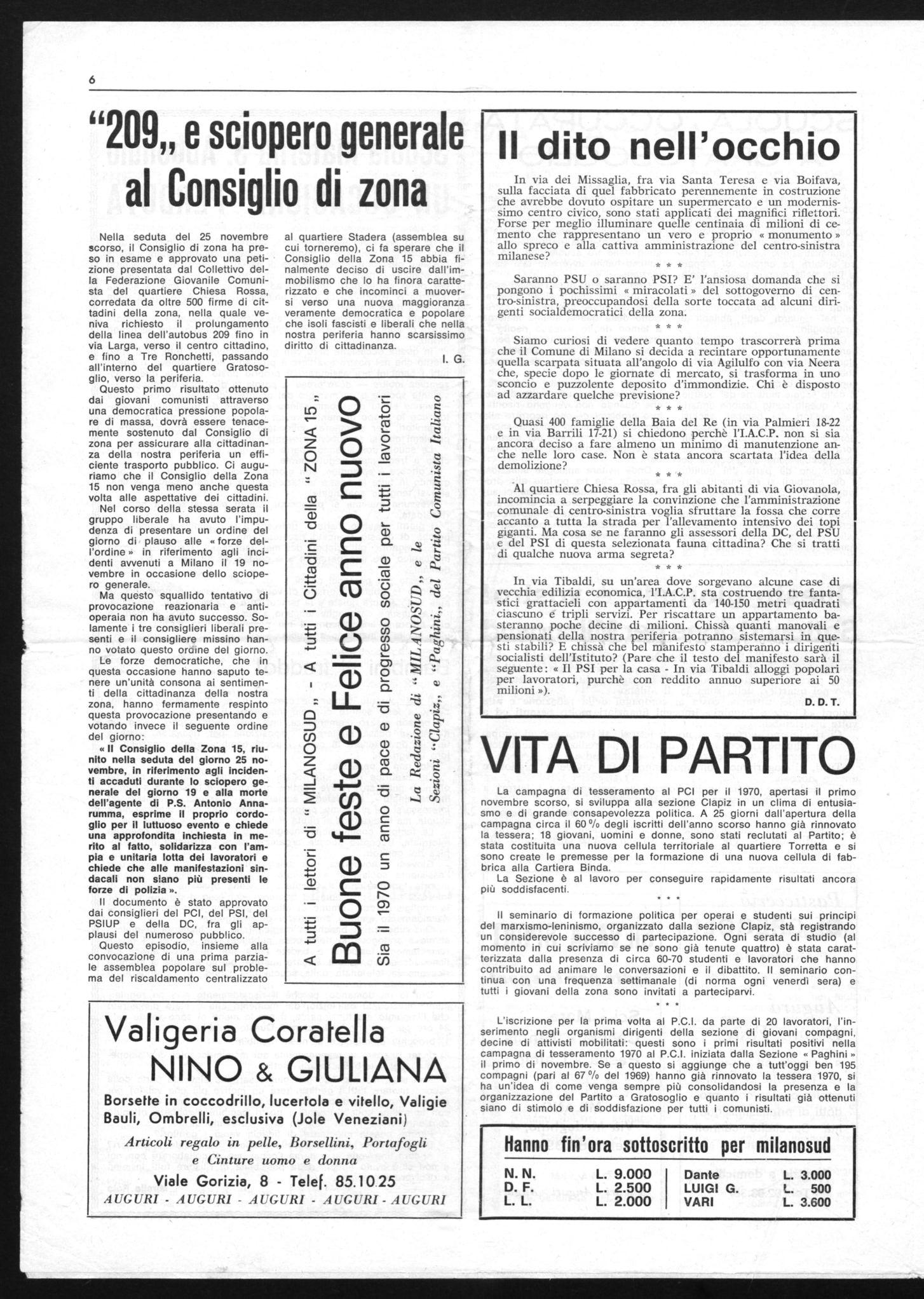 P.S. - Ricordiamo che le lettere e la sottoscrizione vanno inviate a « Milanosud », Via Neera 7, Milano - Via Gratosoglio 108, Milano.