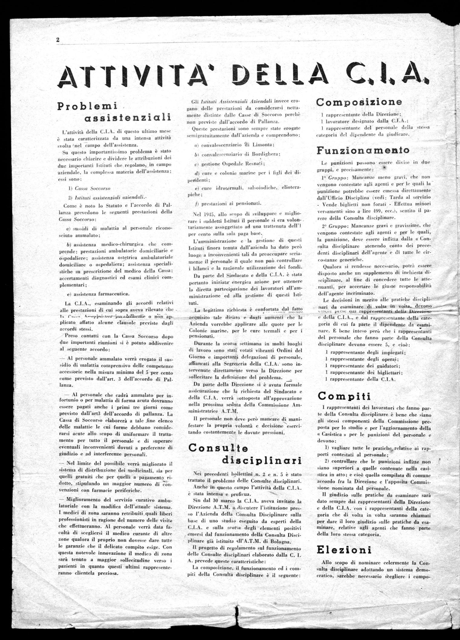 Sin dal 30 marzo la C.I.A. aveva invitato la Direzione A.T.M. a. discutere l'istituzione presso l'Azienda della Consulta Disciplinare sulla base di uno studio eseguito da esperti della C.I.A. e sulla scotta degli elementi positivi emersi dal funzionamento della Consulta Disciplinare già istituita sll'A.T.M. di Bologna. Il progetto di regolamento sul funzionamento delle Consulte disciplinari elaborato dalla C. I. A. prevede queste caratteristiche: La composizione, il funzionamento ed i compiti della Consulta disciplinare è il seguente:
