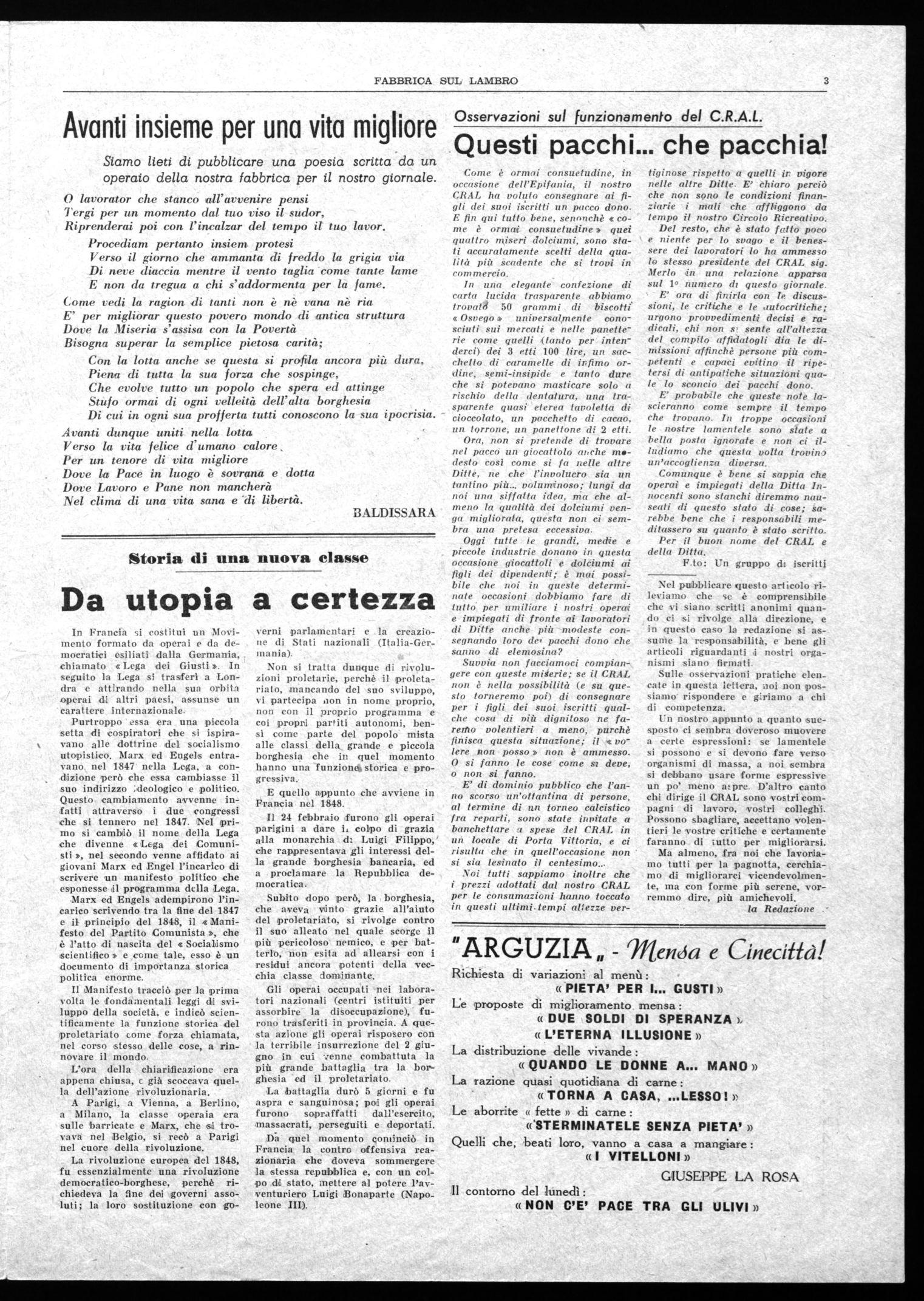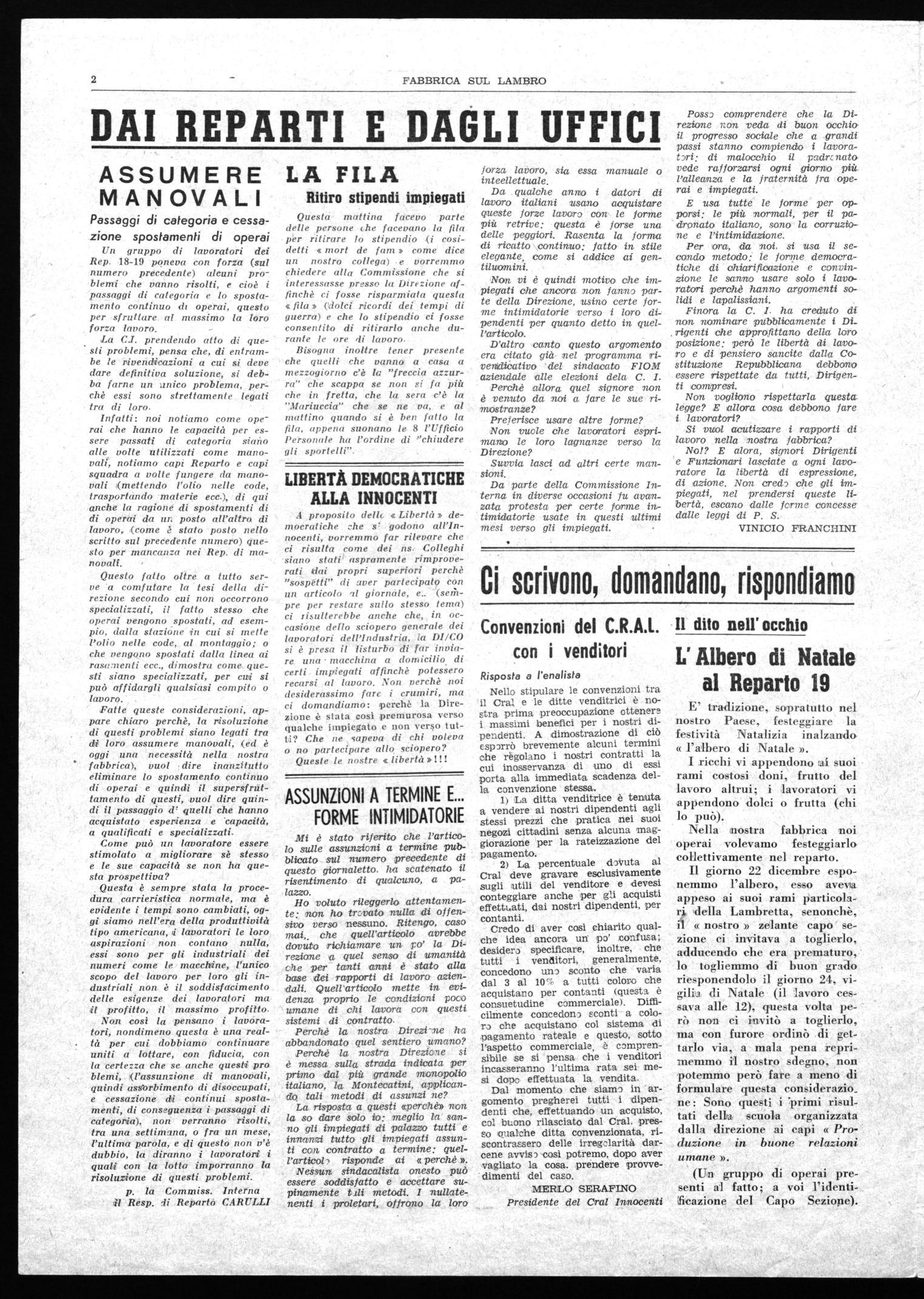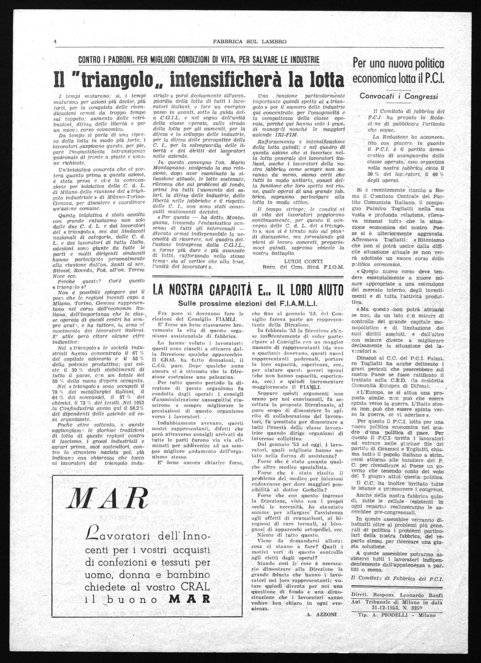 Raforzamento e intensificazione della lotta quindi; e nel quadro di questa azione che si inserisce nella lotta generale dei lavoratori italiani, anche i lavoratori della nostila fabbrica come sempre non sa,ranno da meno, siamo certi che tutti in, modo unitario, consci della funzione che loro spetta nel rione, quale operai di una grande fabbrica, sapranno partecipare alla lotta in modo attivo.