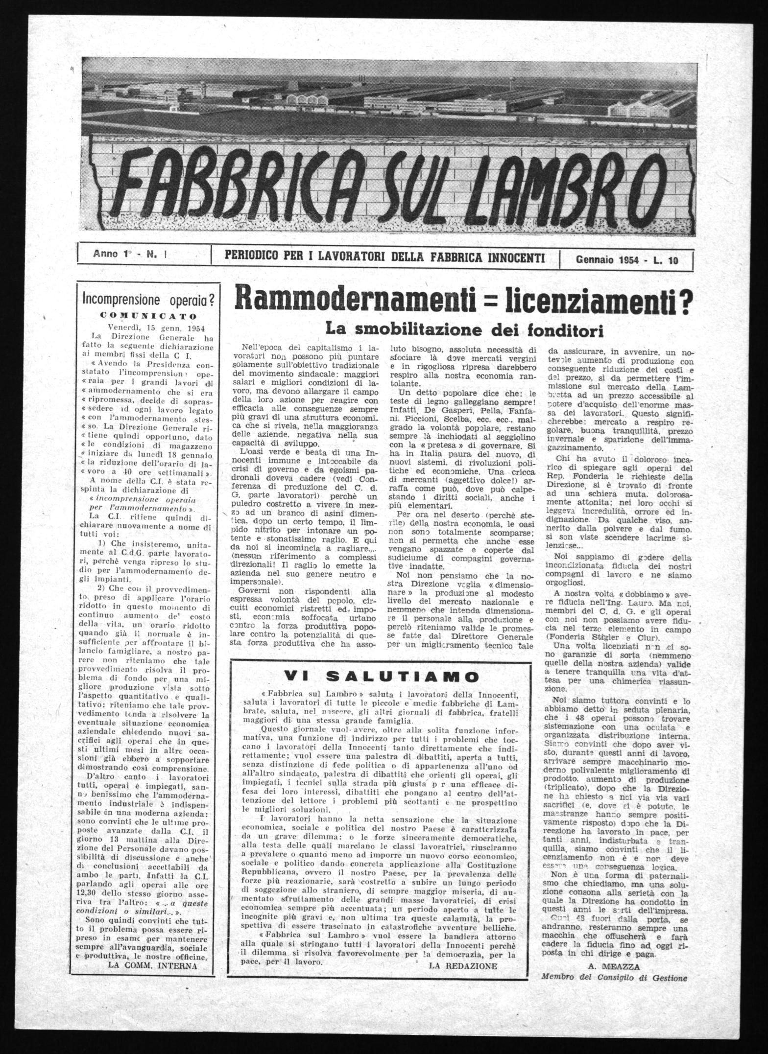 Fabbrica sul Lambro » saluta i lavoratori della Innocenti, saluta i lavoratori di tutte le piccole e medie fabbriche di Lambrate, saluta, nel iviscère, gli altri giornali di fabbrica, fratelli maggiori di. una stessa grande famiglia.