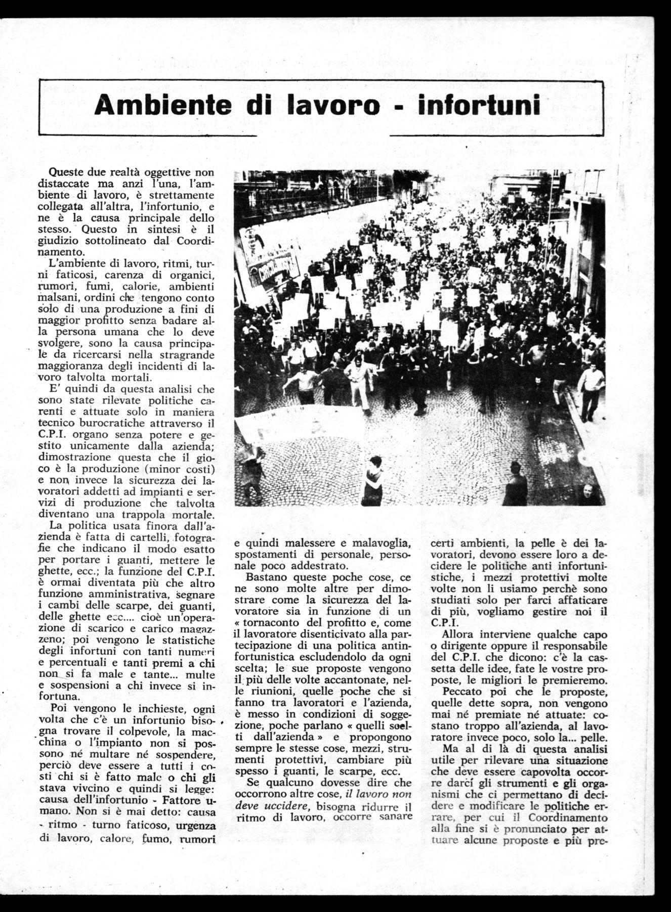 Bastano queste poche cose, ce ne sono molte altre per dimostrare come la sicurezza del lavoratore sia in funzione di un tornaconto del profitto e, come il lavoratore disenticivato alla partecipazione di una politica antinfortunistica escludendolo da ogni scelta; le sue proposte vengono il più delle volte accantonate, nelle riunioni, quelle poche che si fanno tra lavoratori e l'azienda, è messo in condizioni di soggezione, poche parlano « quelli soelti dall'azienda » e propongono sempre le stesse cose, mezzi, strumenti protettivi, cambiare più spesso i guanti, le scarpe, ecc.