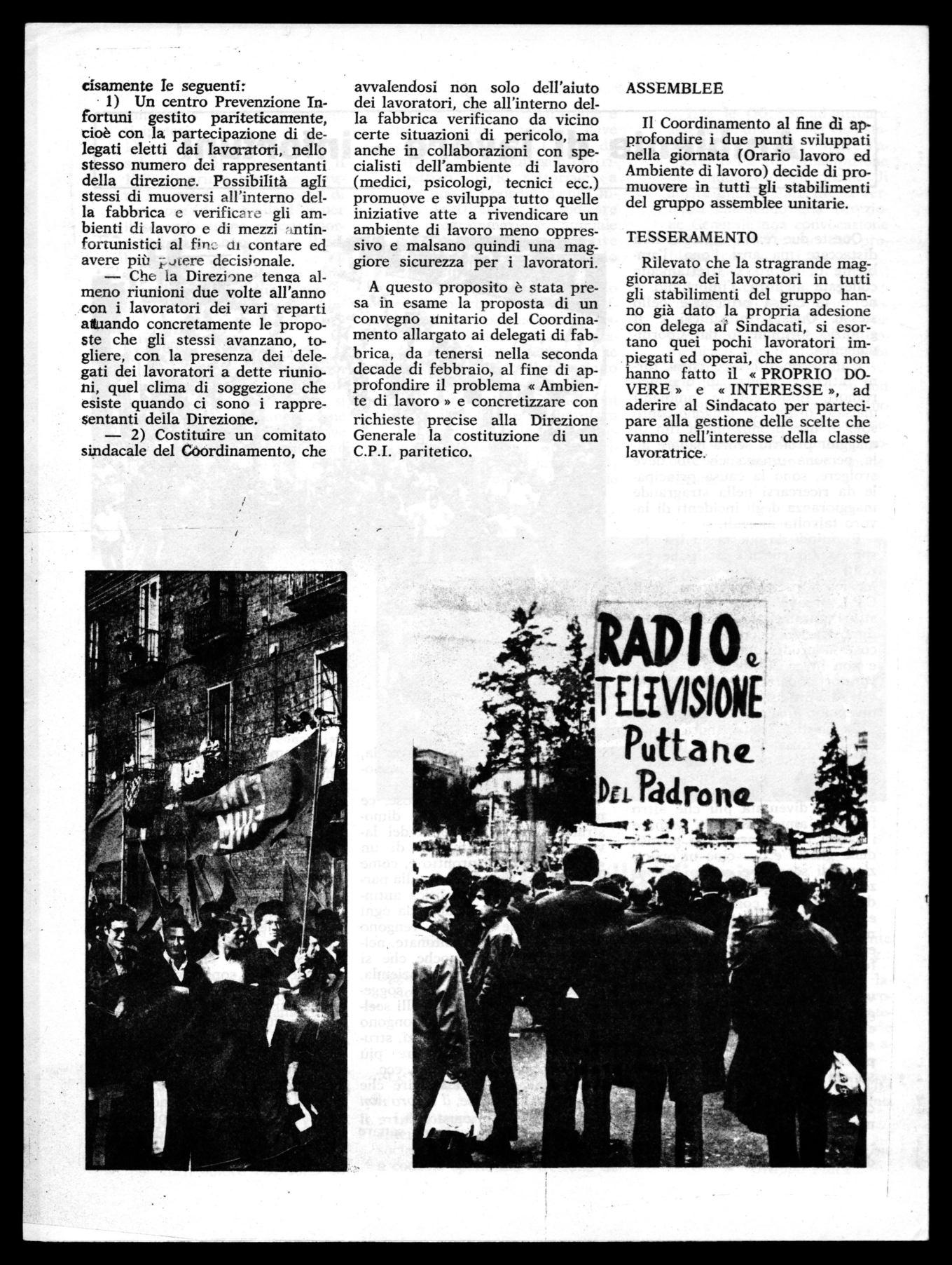 A questo proposito è stata presa in esame la proposta di un convegno unitario del Coordinamento allargato ai delegati di fabbrica, da tenersi nella seconda decade di febbraio, al fine di approfondire il problema « Ambiente di lavoro » e concretizzare con richieste precise alla Direzione Generale la costituzione di un C.P.I. paritetico.