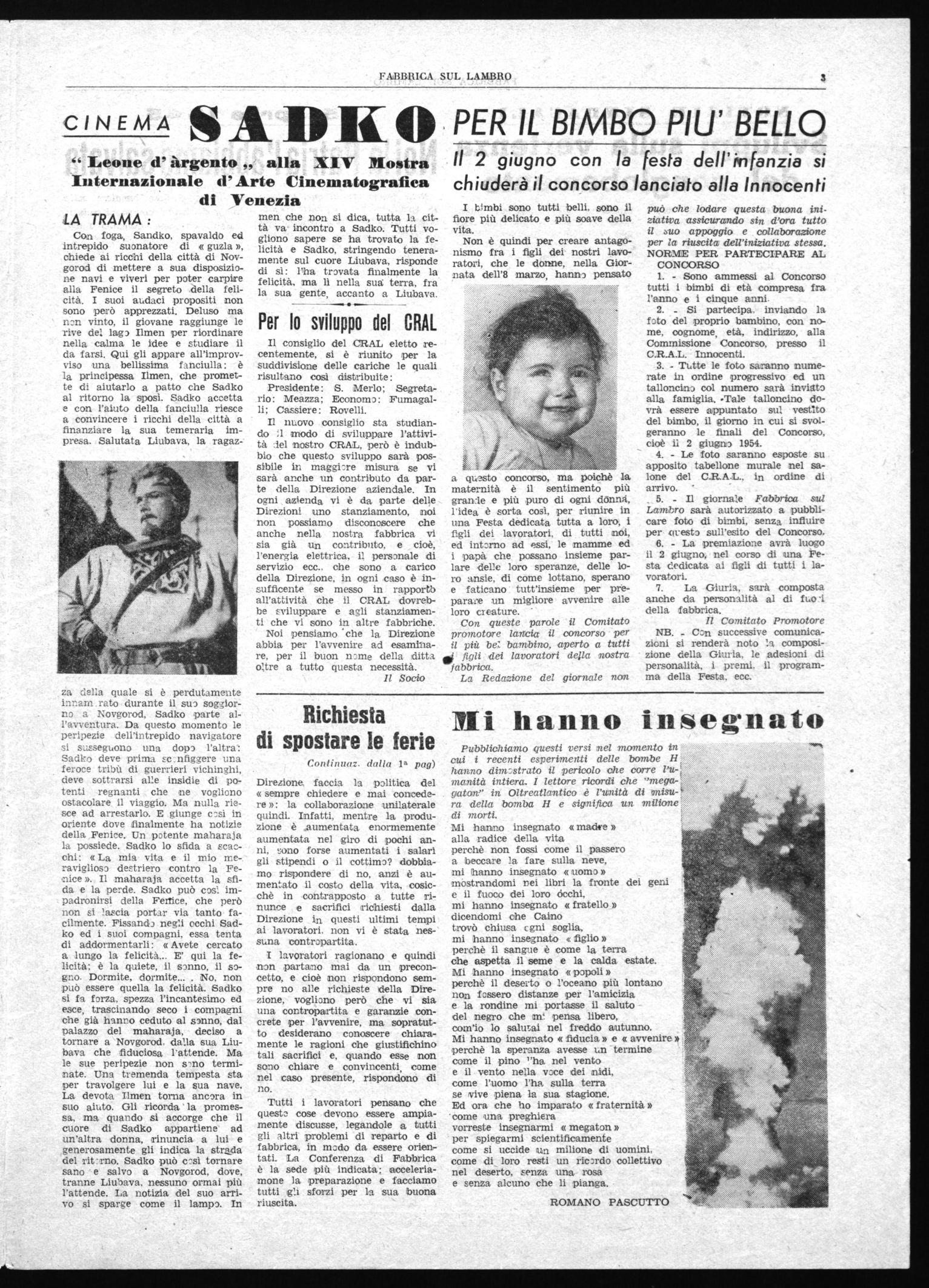 Con queste parole il Comitato promotore lancia il concorso per il più bel bambino, aperto a tutti fis figli dei lavoratori della nostra fabbrica.