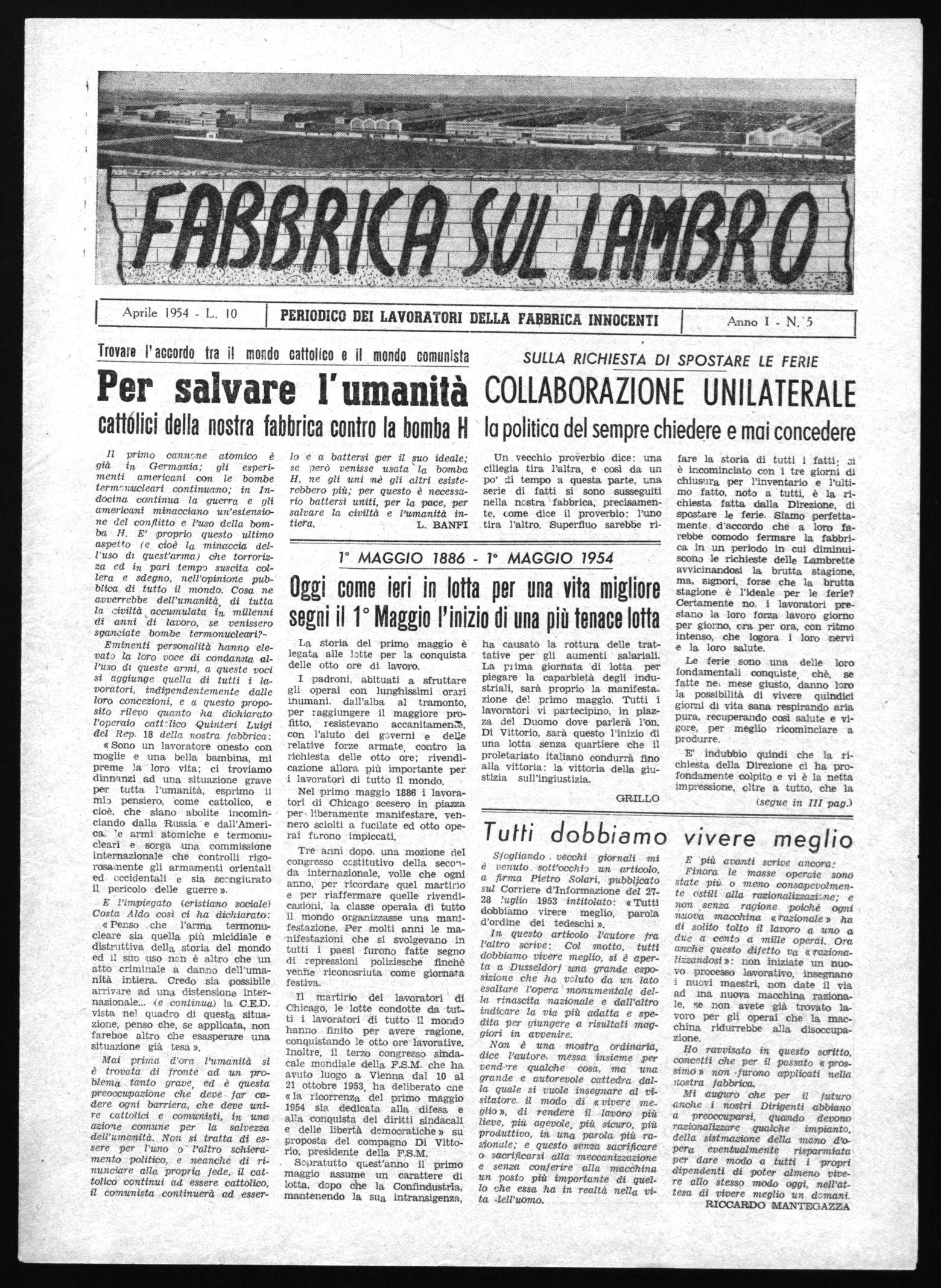 Il martirio dei lavoratori di Chicago, le lotte condotte da tutti i lavoratori di tutto il mondo hanno finito per avere ragione, conquistando le otto ore lavorative. Inoltre, il terzo congresso sindacale mondiale della F.S.M. che ha avuto luogo a Vienna dal 10 al 21 ottobre 1953, ha deliberato cne « la ricorrenza del primo maggio 1954 sia, dedicata alla difesa e alla conquista dei diritti sindacali delle libertà democratiche » su proposta del compagno Di Vittorio, presidente della F.S.M. Sopratutto quest'anno il primo maggio assume un carattere di lotta, dopo che la Confindustria, mantenendo la sua intransigenza,