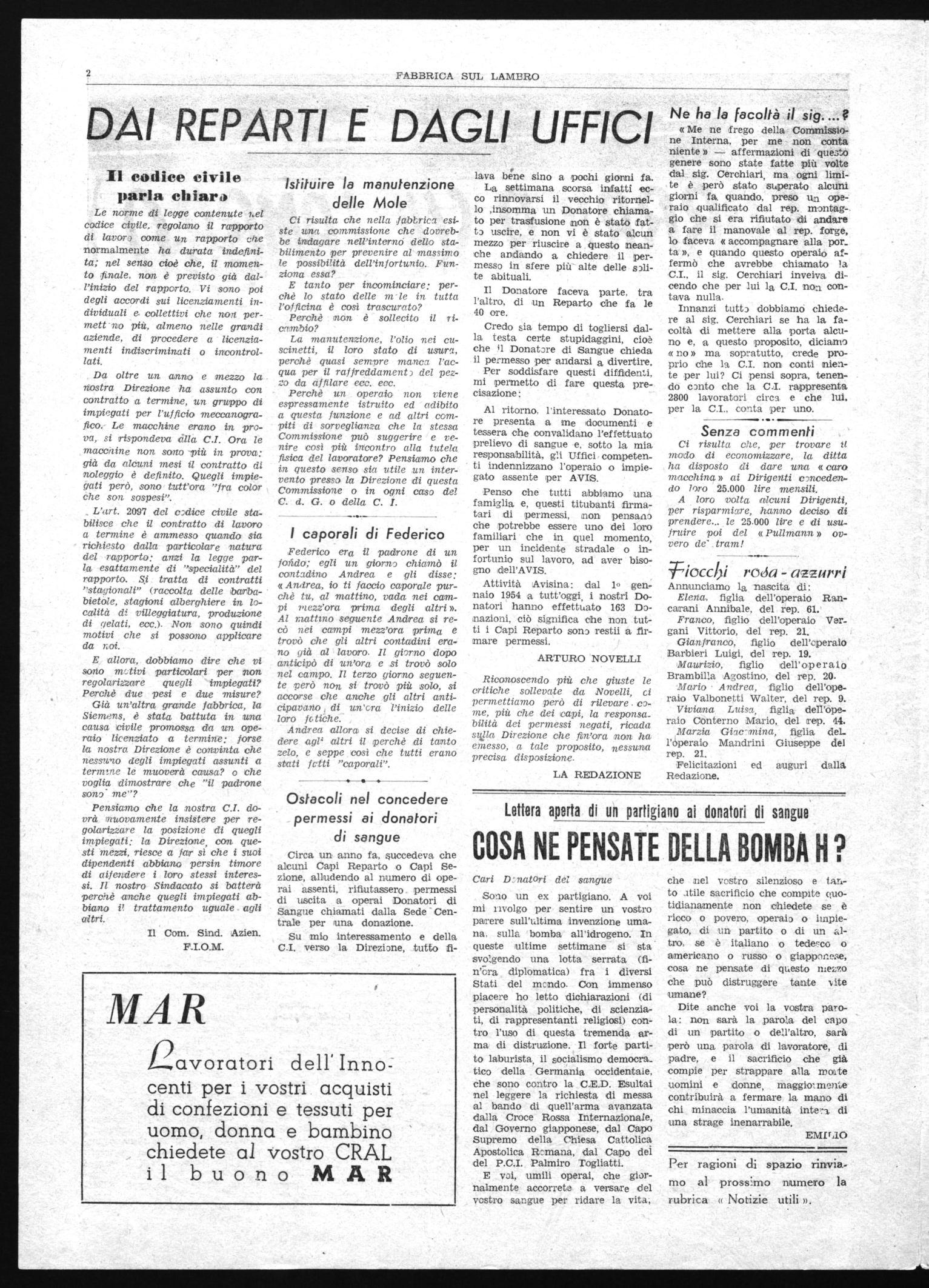 Sono un ex partigiano. A voi mi rivolgo per sentire un vostro parere sull'ultima invenzione umana, sulla bomba all'idrogeno. In queste ultime settimane si sta" svolgendo una lotta serrata (fin'a.a diplomatica) fra i diversi Stati del mondo. Con immenso piacere ho letto dichiarazioni (di -personalità politiche, di scienziati, di rappresentanti religiosi) contro l'uso di questa tremenda arma di distruzione. Il forte partito laburista, il socialismo democra_ tico della Germania occidentale, che sono contro la C.E.D. Esultai nel leggere la richiesta di messa al bando di quell'arma avanzata dalla Croce Rossa Internazionale, dal Governo giapponese, dal Capo Supremo della Chiesa Cattolica Apostolica Romana, dal Capo del del P.C.I. Palmiro Togliatti.