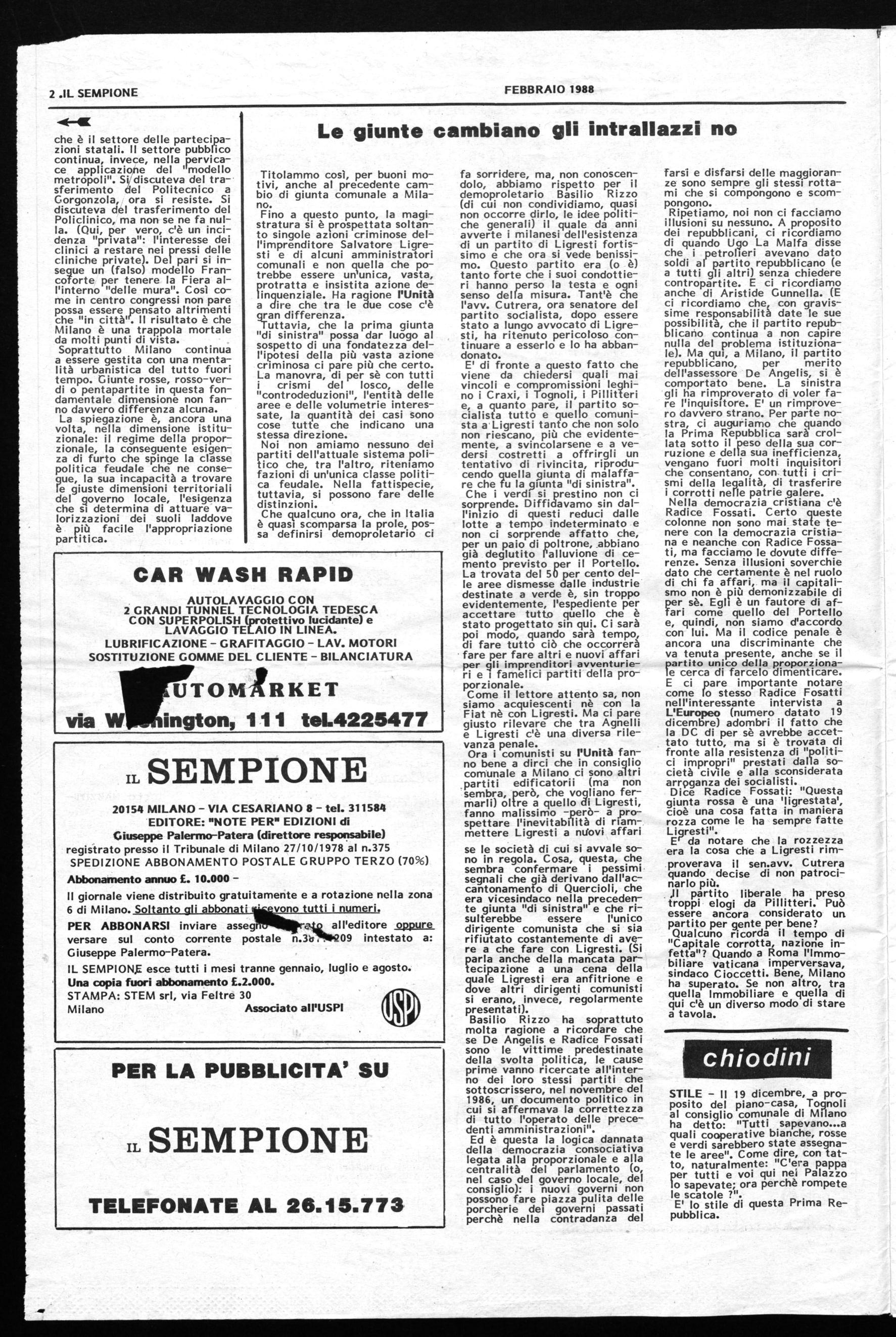 farsi e disfarsi delle maggioranze sono sempre gli stessi rottami che si compongono e scompongono. Ripetiamo, noi non ci facciamo illusioni su nessuno. A proposito dei repubblicani, ci ricordiamo di quando Ugo La Malfa disse che i petrolieri avevano dato soldi al partito repubblicano (e a tutti gli altri) senza chiedere contropartite. E ci ricordiamo anche di Aristide Gunnella. (E ci ricordiamo che, con gravissime responsabilità date le sue possibilità, che il partito repubblicano continua a non capire nulla del problema istituzionale). Ma qui, a Milano, il partito repubblicano, per merito dell'assessore De Angelis, si è comportato bene. La sinistra gli ha rimproverato di voler fare l'inquisitore. E un rimprovero davvero strano. Per parte nostra, ci auguriamo che quando la Prima Repubblica sarà crollata sotto il peso della sua corruzione e della sua inefficienza, vengano fuori molti inquisitori che consentano, con tutti i crismi della legalità, di trasferire i corrotti nelle patrie galere. Nella democrazia cristiana c'è Radice Fossati. Certo queste colonne non sono mai state tenere con la democrazia cristiana e neanche con Radice Fossati, ma facciamo le dovute differenze. Senza illusioni soverchie dato che certamente è nel ruolo di chi fa affari, ma il capitalismo non è più demonizzabile di per sè. Egli è un fautore di affari come quello del Portello e, quindi, non siamo d'accordo con lui. Ma il codice penale è ancora una discriminante che va tenuta presente, anche se il partito unico della proporzionale cerca di farcelo dimenticare.