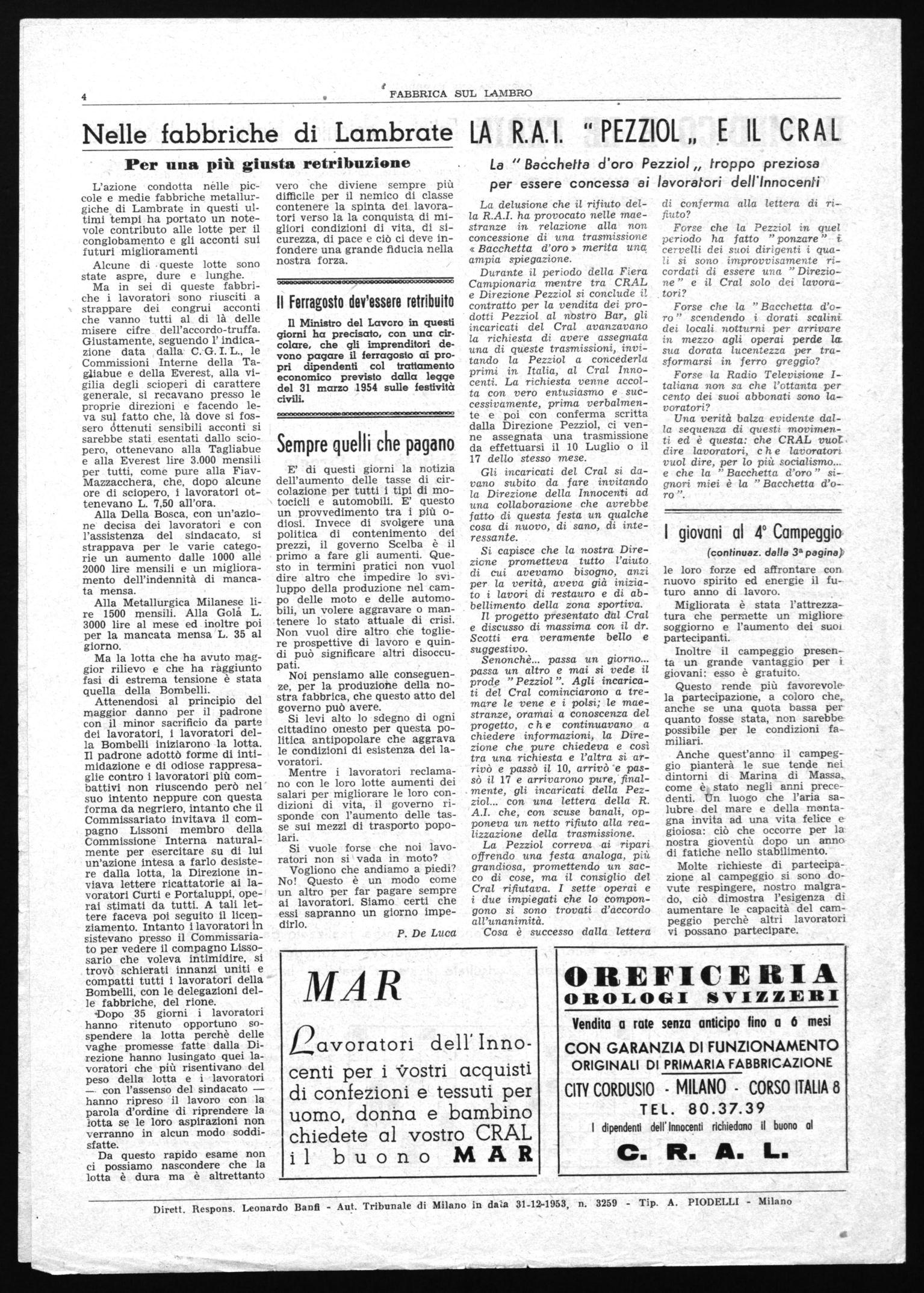 Nelle fabbriche di Lambrate LA R.A.I. " PEZZIOL „ E IL CRAL